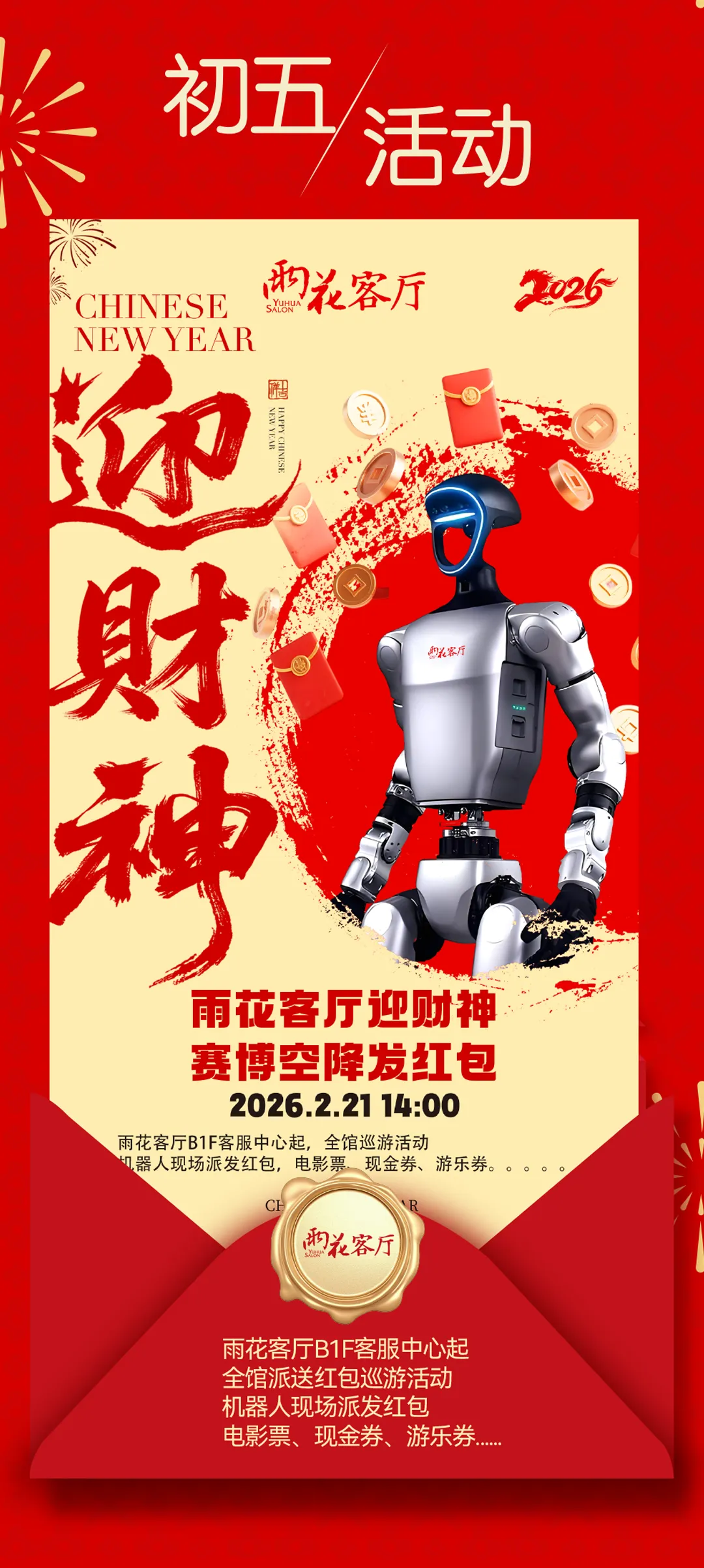 ⬇️营业时间调整⬇️2.16(除夕)10:00-15:002.15/ 2.17-2.23(大年初一至初七)雨花客厅赢财神,赛博空降发红包!2.21大年初五 14:00 雨花客厅B1F客服中心起,全馆巡游活动,机器人现场派发红包,电影票 现金券、游乐券...!即日起-2.24【宝庆银楼】满520元立减52元/满1314立减131,以旧换新0工费、0损耗、0增购!