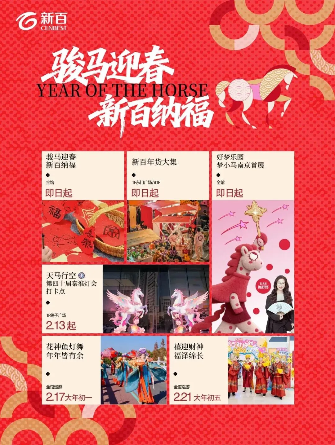 ⬇️营业时间调整⬇️2.16(除夕)10:00-17:002.17-2.23(大年初一至初七)10:00-22:00年在一起,爱在「水游」!「玫瑰雪屋」梦幻登场,简单发帖,就能轻松赢取秦淮灯会门票;2.14当天领证的CP们,还有机会抽中假日酒店浪漫房券!情人节当天还有小型Live音乐会等着你!即日起-2.15馆内美食50元购100元、时尚零售满500元送50元储值卡、运动潮服900元购1000服饰券!2.16(除夕)10:00-17:002.17-2.23(大年初一至初七)10:00-21:00新百高甜送礼!国际美妆 满1000减200、黄金珠宝 至高克减100、消费满额还送玫瑰花,最高资生堂礼盒!即日起-3.19一楼东门广场/B1F新百年货大集;即日起-3.10全馆好梦乐园梦小马南京首展;2.17大年初一花神鱼灯舞全馆巡游;2.21大年初五禧迎财神全馆巡游!