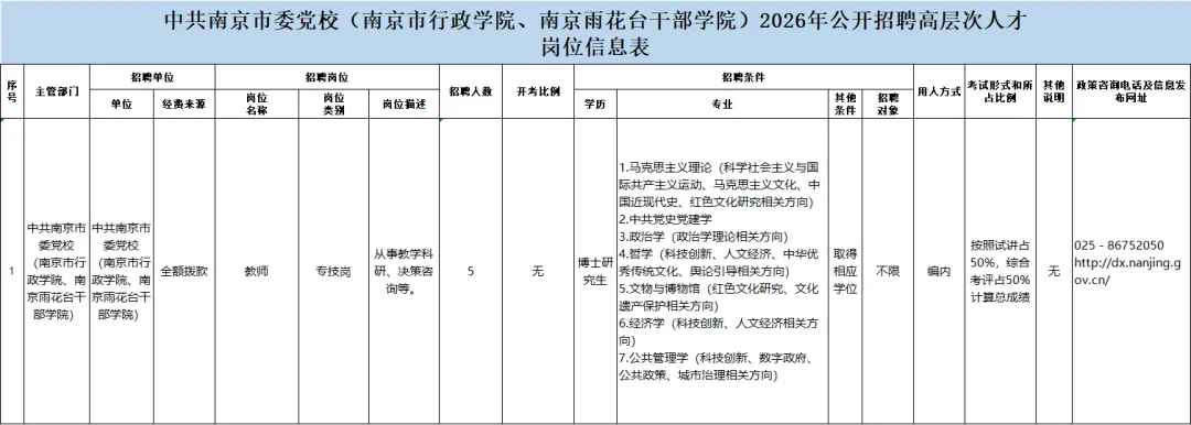本次招聘相关信息在南京市人力资源和社会保障局网(http://rsj.nanjing.gov.cn)、中共南京市委党校(南京市行政学院、南京雨花台干部学院)(http://dx.nanjing.gov.cn/)等网站发布,具体岗位、数量、资格条件等详见《中共南京市委党校(南京市行政学院、南京雨花台干部学院)2026年公开招聘高层次人才岗位信息表》(附件1,以下简称《岗位信息表》)。