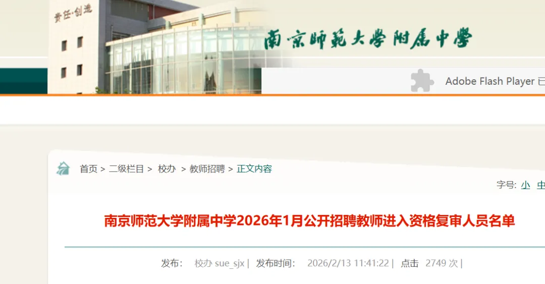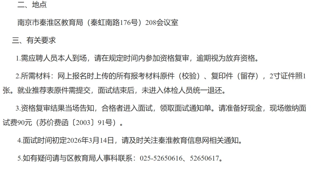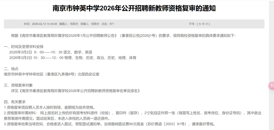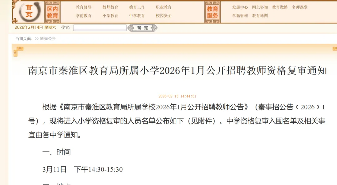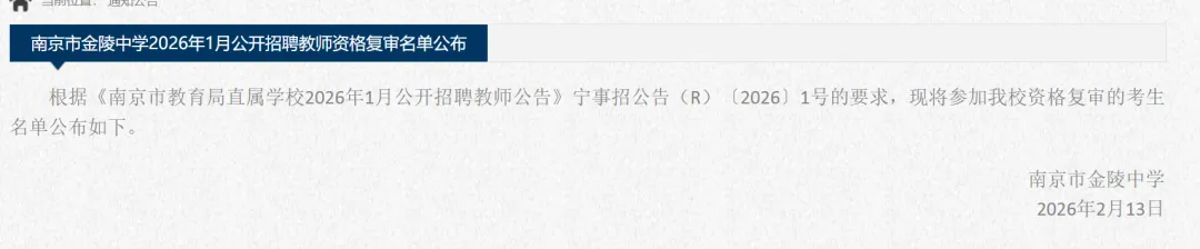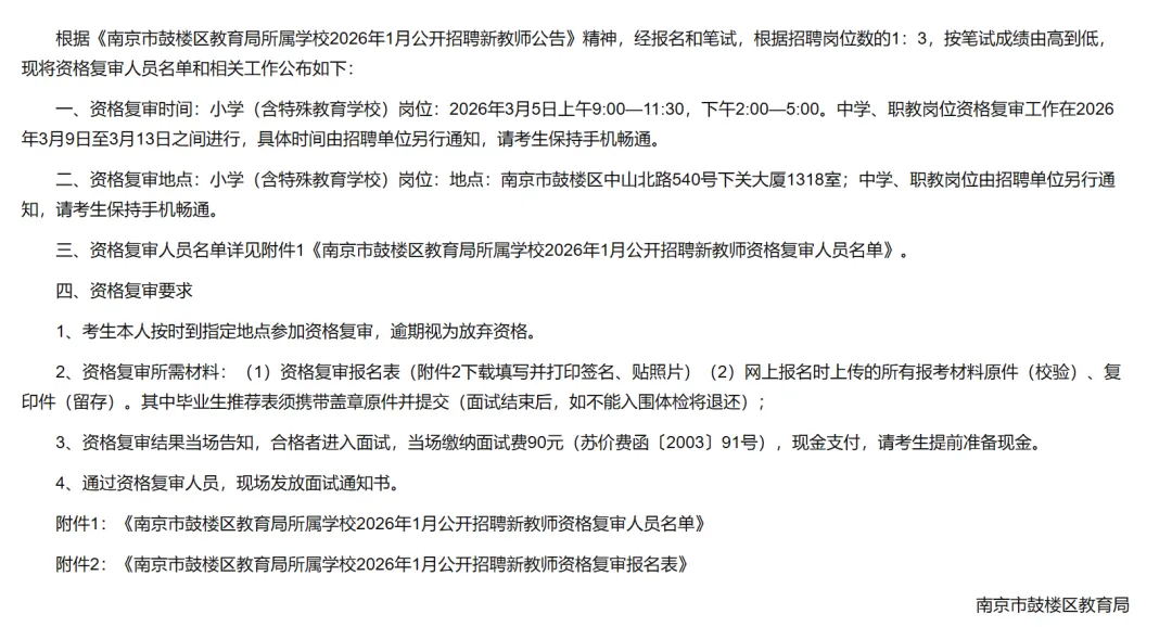 南京社招虽门槛稍低,不需要研究生学历,但比校招的战线长、难度大,2月16日就是丙午马年的除夕夜了,目前南京各区、各校的资格复审还在陆续更新中,考生们还需要密切关注资讯,及时将时间节点、地点、需要携带的材料记在备忘录里,基本都是在年后2月底、3月初,学校都放假了,不知不觉,云朵老师都放假10天了,再回想起以前备考校招的经历,是在1月1日前就全部确定了,11月-12月完成了笔试、面试和签约,整体战线比较多。云朵老师的读研经历也是,夏令营和预推免的战线也很短,无笔试,交完材料申请后,暑期通知了面试和结果,战线要比考研短,所以无论何时,越努力,越幸运,请相信这句话,云朵老师始终坚信! 如果是区级的资格复审,非市直属直接报名到校的,以鼓楼区为例(仅做区级资格复审参照): 第一步,进入“南京市鼓楼区人民政府”(这一步很重要,不是鼓楼区教育局,也不要进入福建的鼓楼或者徐州的鼓楼教育局官网) 在左下角的“信息公开”处,选择第三个“南京市鼓楼区教育局所属学校2026年1月公开招聘新教师资格复审通知: 这里敲重点:鼓楼区集中资格复审的只有小学,而中学、职教,是报名到岗的,要关注学校的官网,准备好相关材料,一般进面都会有电话和短信通知,保持手机畅通非常重要。 资格复审资料:(1)资格复审报名表(附件2下载填写并打印签名、贴照片)(2)网上报名时上传的所有报考材料原件(校验)、复印件(留存)。其中毕业生推荐表须携带盖章原件并提交(面试结束后,如不能入围体检将退还)。 敲重点:第二条网报的所有材料,如身份证复印件、学籍在线验证报告,获奖证书等,都要原件+复印件,所有材料建议多备几份,以防万一。另,毕业生推荐表请不要一表多用,严格遵循一份原件的准则,诚心对待招聘单位。这个提交后,暂不归还,只有确定未能入围体检,才会退还。 资格复审结果当场告知,合格者进入面试,当场缴纳面试费90元(苏价费函〔2003〕91号),现金支付,请考生提前准备现金。通过资格复审人员,现场发放面试通知书。 如果是报名到校,一般以中学为主,需要关注学校官网的信息,最近校办都在忙碌招聘的工作,要注意接收资格复审和面试通知,过年期间认真准备材料! 截至目前:钟英中学、南京外国语学校、文枢高级中学、南京师范大学附属中学、人民中学、金陵中学、秦淮区小学、鼓楼区小学都已发布资格复审通知。南京市钟英中学资格复审通知