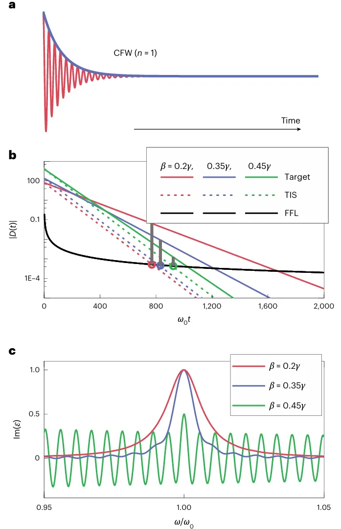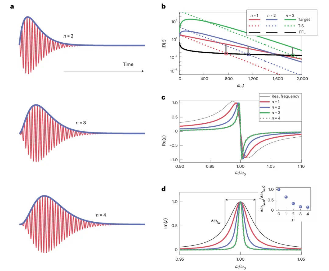图2:基于损耗补偿,高阶虚拟增益合成激发(n=1(红)是传统快衰减;n=2(蓝)、n=3(绿)则呈现“先缓后急”的慢衰减特性)