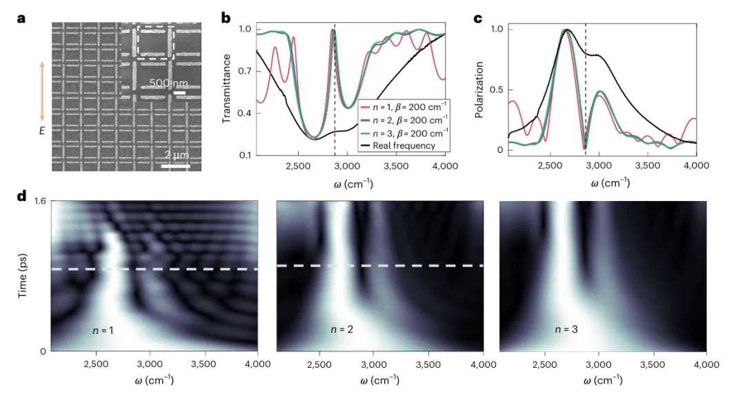 图3:利用高阶虚拟增益激发恢复等离激元共振的实验演示(黑色是原始模糊信号,红色(n=1)有强振荡,蓝色(n=2)和绿色(n=3)则干净得多)