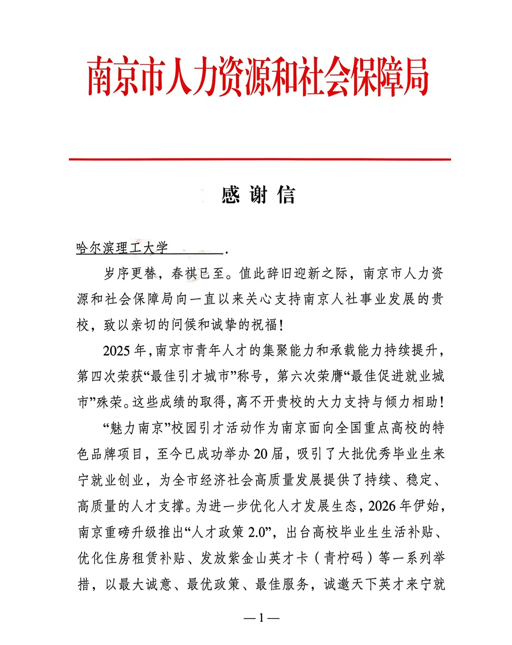【喜报】南京市人力资源和社会保障局致学校感谢信