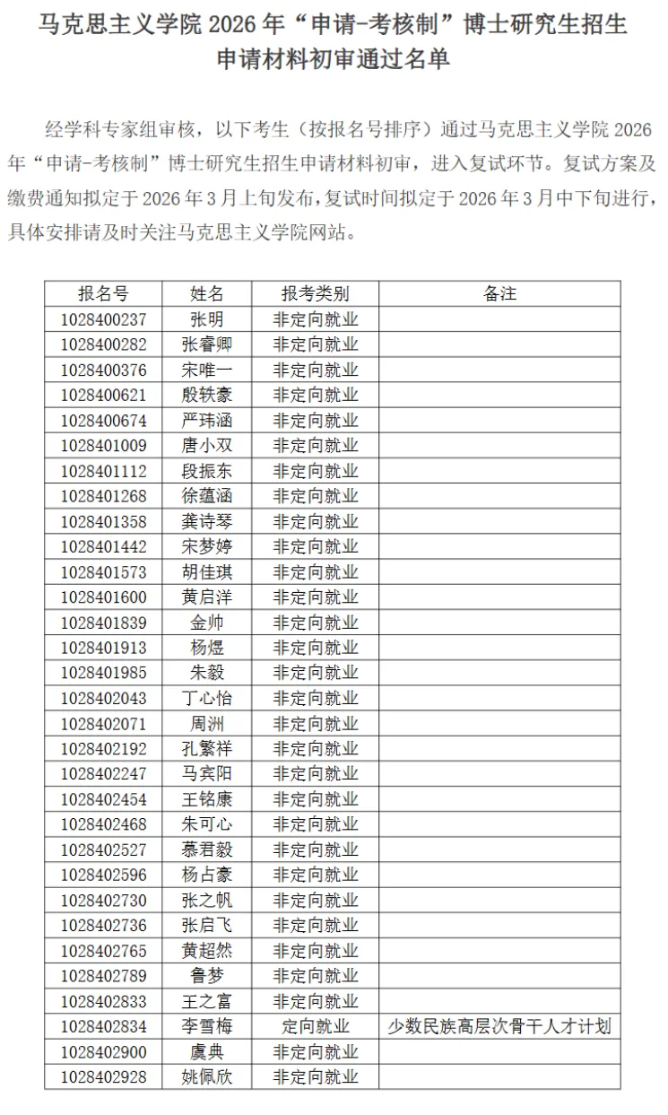 南京大学马克思主义学院2026年“申请-考核制”博士研究生招生申请材料初审通过名单