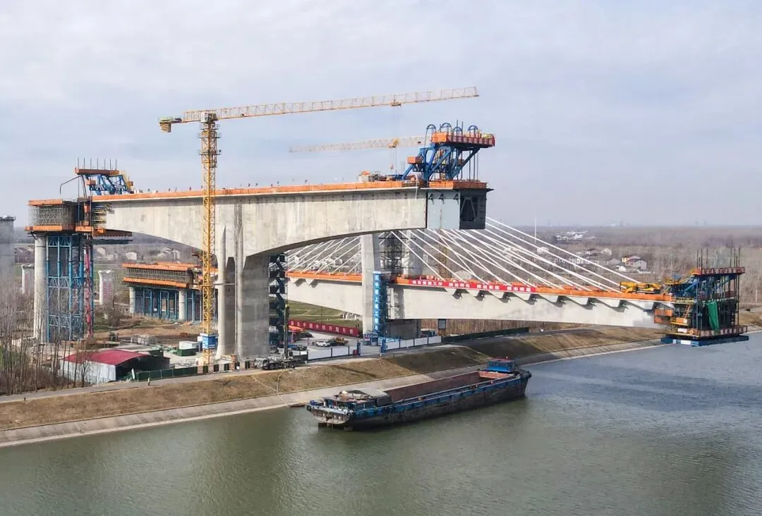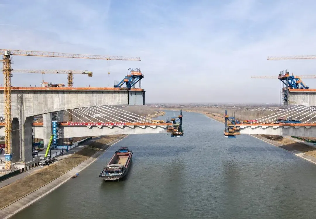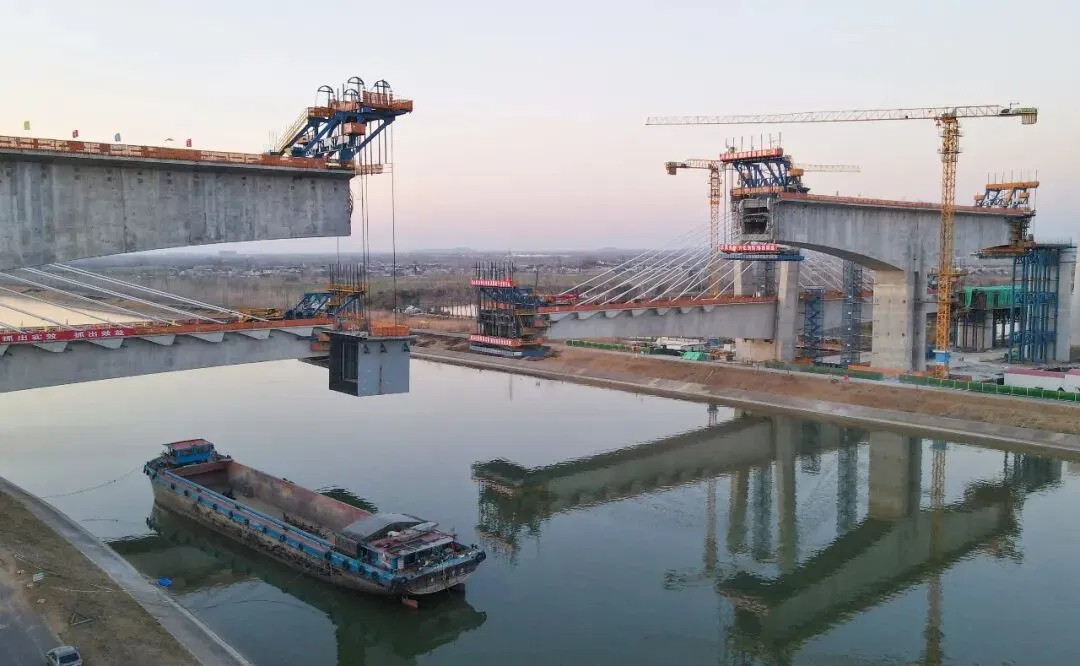 作为铁路全线的控制性工程之一,沪宁合高铁六合特大桥跨滁河段主梁采用钢混结构,由预应力混凝土箱梁、钢箱梁及钢混接头构造三部分组成。其中主跨跨中84米梁段为钢箱梁,其余节段采用预应力混凝土箱梁,钢梁与混凝土箱梁通过钢混接头实现刚性连接。该钢混结合段梁长7.75米、梁高7.85米,顶板宽12.6米、底板宽8.06米,是连接钢混结构的核心关键部位。