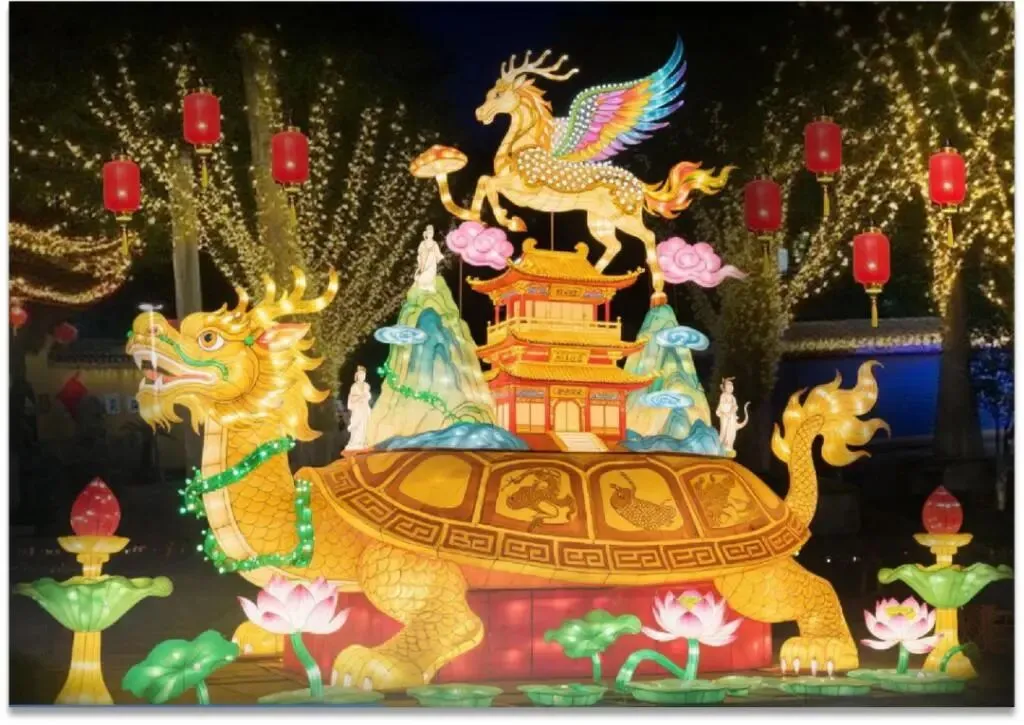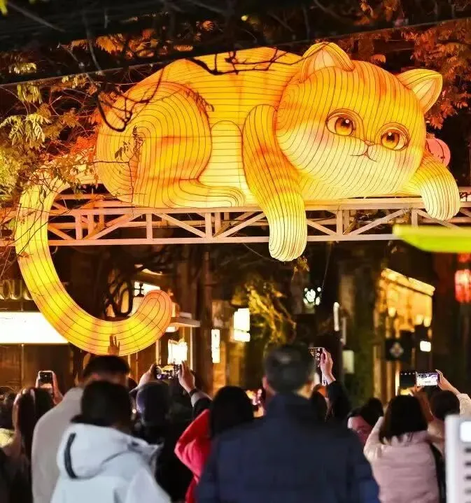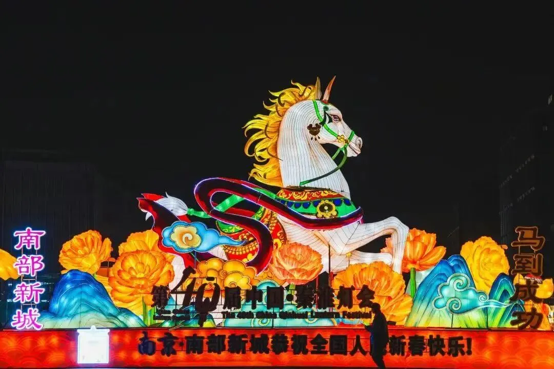 在夫子庙核心展区里,棂星门、文德桥、文源桥三处大型主题灯组惊艳亮相。大成殿展区内,取材自《山海经》的《鹿蜀鸣瑞》《乘黄腾瑞》等灯组同样细节满满。十里秦淮水上展区以“桨声灯影·徜徉中国年”为主题,依托游船动线,运用现代光源叠加传统工艺,生动呈现秦淮灯会40周年发展回顾画卷。而白鹭洲展区以“灯映华彩·夜泊秦淮”为主题,汇聚全国非遗花灯精品,长60米的“五马渡江”动态灯组气势磅礴。将灯彩与江南年俗、丙午马年生肖文化深度融合,呈现了一场兼具历史文脉与青春气息的文化新体验。在老门东展区则可以仰望15米高的巨型“飞马”灯,在999盏“祈福灯树”的星瀑下许愿,邂逅边营巷会眨眼的“胖橘”互动灯,侧边巷子与主干道上,还有各色精美花灯相映。