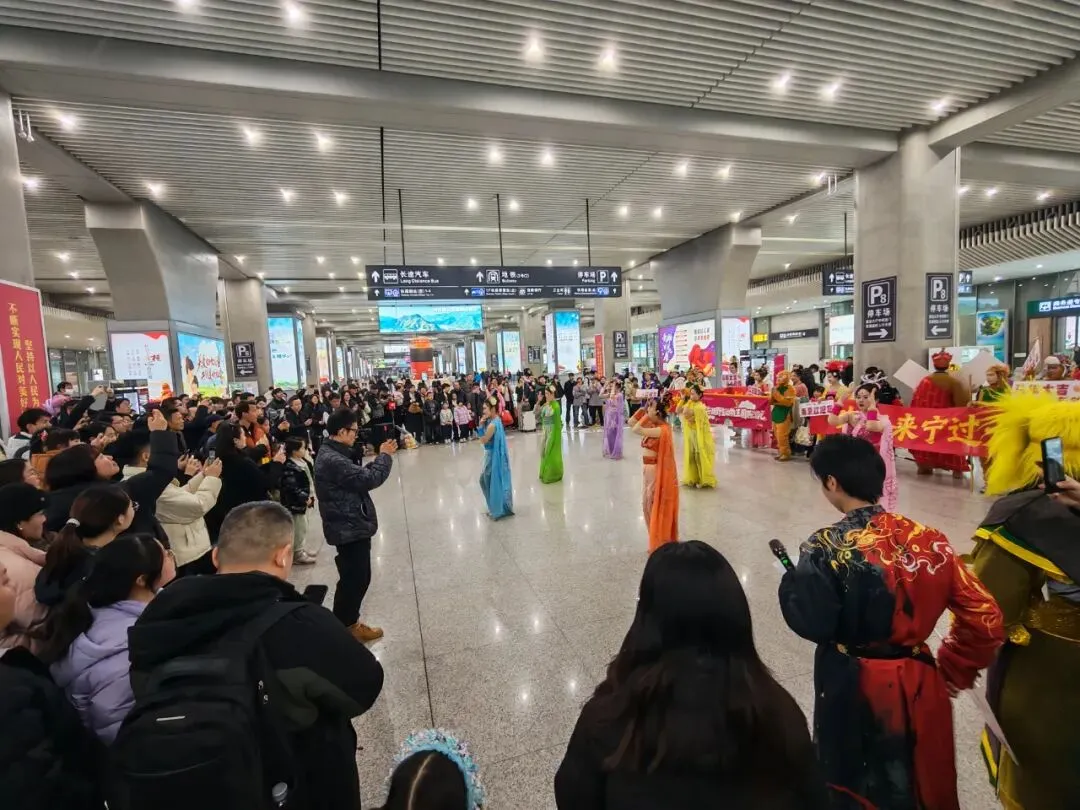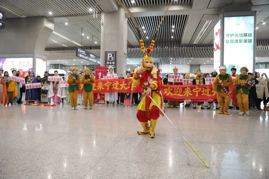 “猴王出世”再现石猴腾空的灵动洒脱,“蜘蛛精舞蹈”身姿曼妙、灵动俏皮,“三圣战三妖”还原经典名场面,还有《敢问路在何方》大合唱、“相亲相爱”团圆舞,让五湖四海的旅客,在南京南站就能感受六朝文脉的厚重与西游传奇的趣味碰撞,把旅途的疲惫,都化作团圆的喜悦。