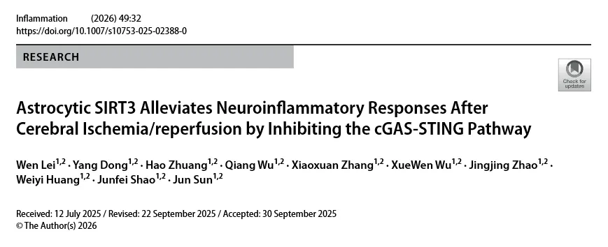 针对缺血性中风后再灌注损伤引发的星形胶质细胞介导神经炎症缺乏有效干预靶点的问题,本研究以 SIRT3(关键细胞调控因子)和 cGAS-STING 通路(先天免疫核心通路)为核心,通过体内大鼠 MCAO/R 模型、体外星形胶质细胞 OGD/R 模型,结合单细胞测序、转录组分析、分子生物学及药理学方法,探究 SIRT3 对神经炎症的调控机制,结果发现缺血再灌注后 SIRT3 表达显著下调,伴随 cGAS-STING 通路激活及促炎因子释放增加,而 SIRT3 激动剂 2-APQC 干预或 SIRT3 过表达可抑制该通路激活,减少梗死体积、改善神经功能,敲低 cGAS 或 STING 也能缓解炎症反应,最终证实星形胶质细胞 SIRT3 通过抑制 cGAS-STING 通路减轻缺血再灌注后神经炎症,为缺血性中风提供了新的治疗靶点。