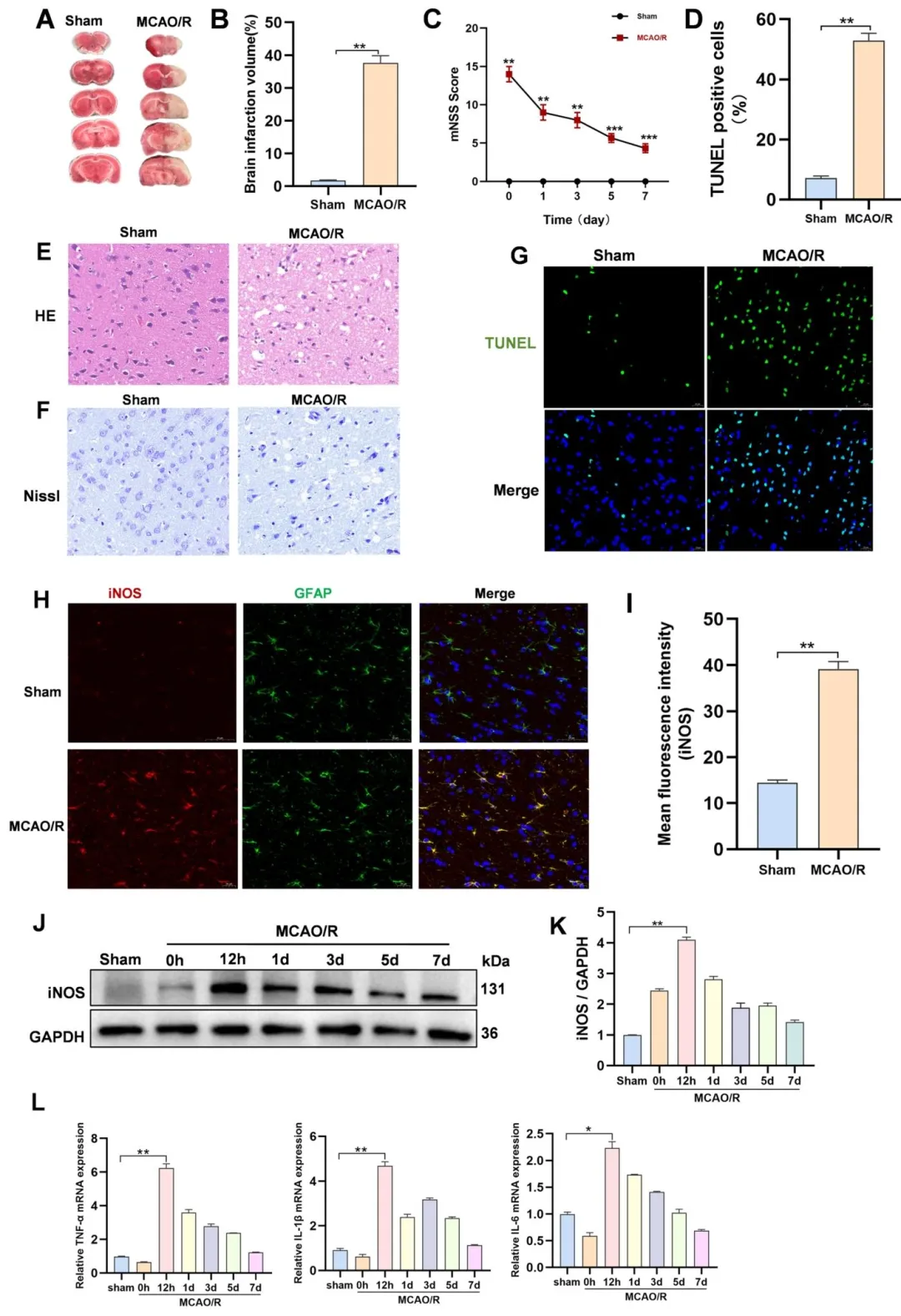 Figure 1:验证 MCAO/R 大鼠模型成功建立,证实缺血再灌注后出现梗死体积增加、神经功能缺损、脑组织损伤及神经炎症激活(iNOS 和促炎因子上调)。