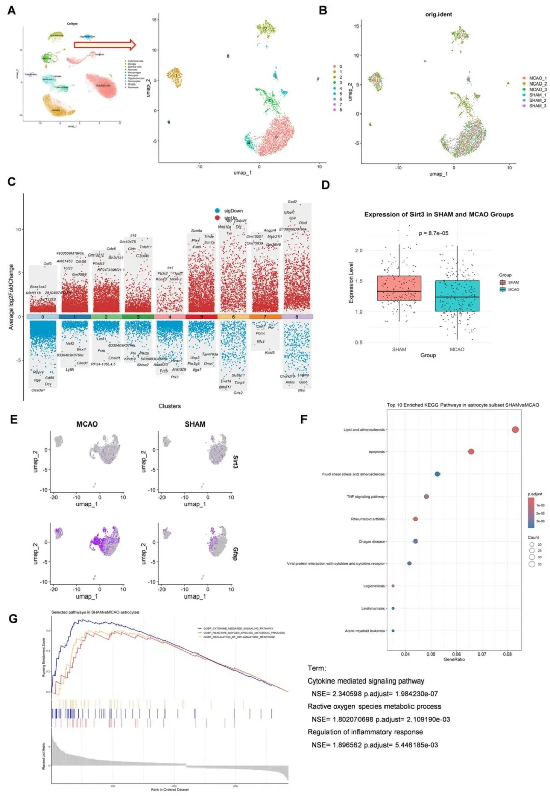 Figure 3:通过单细胞测序揭示 MCAO 后星形胶质细胞亚群分布改变,SIRT3 表达显著下调,且星形胶质细胞功能变化与细胞因子信号、ROS 代谢等炎症相关通路密切相关。