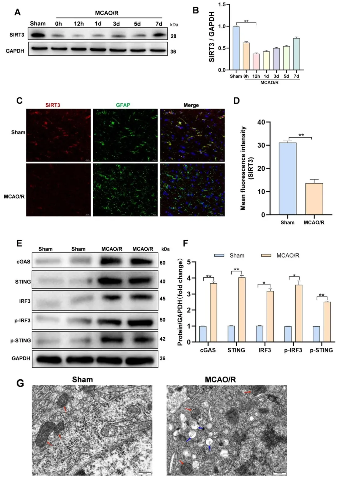 Figure 4:明确 MCAO/R 后大鼠脑内 SIRT3 表达随时间下调,同时 cGAS-STING 通路激活,且脑组织线粒体结构受损,提示二者存在时序关联。