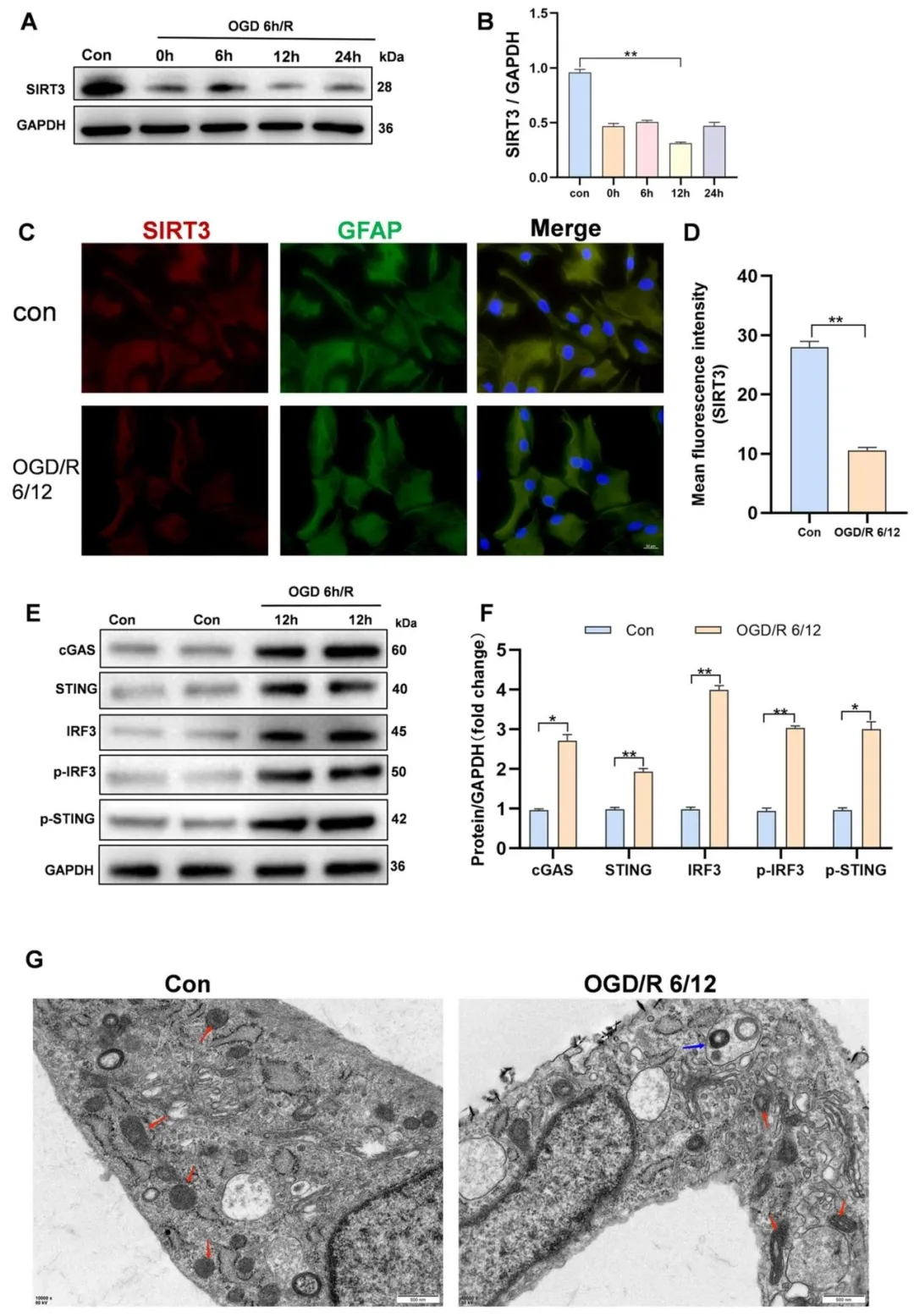 Figure 5:证实 OGD/R 处理后星形胶质细胞中 SIRT3 下调、cGAS-STING 通路激活及线粒体损伤,与体内实验结果相互印证,明确该关联特异性发生于星形胶质细胞。