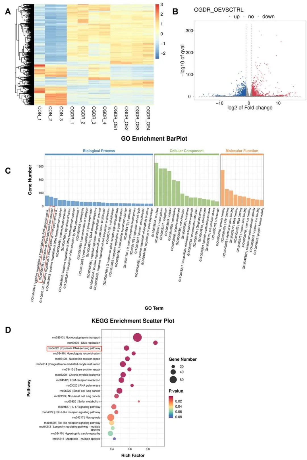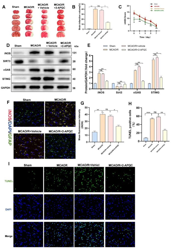 缺血再灌注后(体内 MCAO/R、体外 OGD/R),星形胶质细胞中 SIRT3 表达显著下调,cGAS-STING 通路关键蛋白(cGAS、STING、p-STING 等)激活,促炎因子(TNF-α、IL-1β 等)释放增加,伴随梗死体积扩大、神经功能缺损及线粒体损伤;SIRT3 激动剂 2-APQC(20mg/kg)可减少梗死体积、改善神经功能,抑制 cGAS-STING 通路激活及细胞凋亡;SIRT3 过表达能显著降低 OGD/R 诱导的 cGAS-STING 通路活性、促炎因子释放及 iNOS 表达;敲低 cGAS 或 STING 可有效缓解 OGD/R 介导的星形胶质细胞炎症反应;转录组分析显示 SIRT3 过表达显著富集 “胞质 DNA 感知通路” 等相关差异基因,进一步证实其调控 cGAS-STING 通路的分子机制。