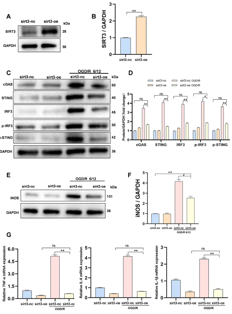 Figure 7:证实 SIRT3 过表达能抑制 OGD/R 诱导的星形胶质细胞 cGAS-STING 通路激活,减少 iNOS 表达及促炎因子释放,明确 SIRT3 的直接调控作用。
