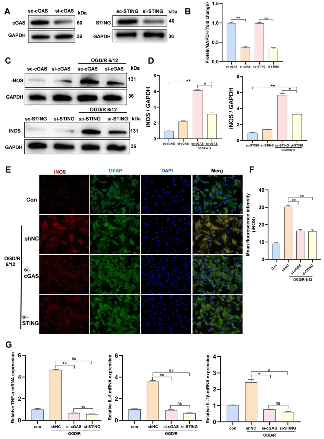Figure 9:表明敲低 cGAS 或 STING 可有效下调 OGD/R 处理的星形胶质细胞中 iNOS 表达及促炎因子释放,直接证实 cGAS-STING 通路是星形胶质细胞神经炎症的关键介导者。