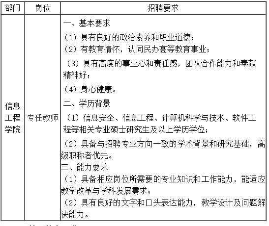 学校依托南京航空航天大学优质师资和专业特色,由国内知名高校教授担任学科专业带头人,聘请诺贝尔经济学奖获得者埃里克·马斯金教授、俄罗斯工程院外籍院士夏志杰教授等知名学者为专业导师,吸引一大批部队和地方“双一流”高校的专家教授来校工作,教师队伍的结构和质量发生了根本性变化。近3年来,获国家级奖近40项,一等奖15项;获省部级奖120余项。其中,在第三届全国高校教师教学创新大赛中获全国二等奖1项,全国高等学校教师图学与机械课程示范教学与创新教学法观摩竞赛中获一等奖6项、二等奖5项,第三届全国金工/工训青年教师微课教学评优中获得特优1项、优秀1项,基于示范“金课”建设的“科明杯”全国微课程竞赛一等奖3项、二等奖1项。 学校秉持“高端化、全球化、个性化”的人才培养理念,现已逐步发展为以航空为特色,以工为主,工、经、艺、管、文、法等多学科协调发展的应用型科技大学。学校下设10个教学单位,开设62个本科专业(含方向)。其中,会计学专业为国家级一流本科专业,电气工程及其自动化、车辆工程、信息工程3个专业为省级一流本科专业,电气工程及其自动化专业为江苏省产教融合型品牌专业。机械电子工程、信息工程、英语专业获评江苏省独立学院“星级专业”。 学校坚持开放办学,注重学生国际化能力的培养,先后与美国、英国、法国、加拿大、澳大利亚、韩国、新加坡等12个国家的150余所大学开展交流合作,培养造就具有中国情怀、世界眼光的未来新型高端人才。 学校注重学生的创新能力培养,促进学生的多元化、个性化发展,全面实施“创意、创造、创业”创新人才培养模式,大力开展科技创新竞赛活动。在多项全国性重大竞赛中接连取得突破,获奖人数和奖项等级位居全国同类院校前列。近3年来,获国家级奖近1000项,一等奖近400项;获省部级奖2300余项。其中,在全国大学生机器人大赛RoboMaster、全国大学生智能汽车竞赛、全国大学生电子设计竞赛、全国大学生先进成图技术与产品信息建模创新大赛、全国大学生嵌入式芯片与系统设计竞赛、全国高校商业精英挑战赛、未来设计师全国高校数字艺术设计大赛等重大竞赛中均斩获多项一等奖。 学校与国际接轨的办学理念、与行业和区域协调发展的办学实践、为地方提供智力支持以及培养应用型人才的丰硕成果,赢得了良好的社会知名度和美誉度,就业率、考研率和出国深造率在全国民办高校中名列前茅,荣获全国“首届中国创新榜样”、江苏省“5A级社会组织”、江苏省“五一劳动奖状”;同时,被腾讯、网易、新华、新浪四大中国影响力媒体机构评选为“社会影响力独立学院”“最受欢迎独立学院”“品牌实力独立学院”和“综合实力独立学院”。 面向未来,学校将秉持“修学储能、经世致用”的校训,贯彻“文化引领、创新驱动、内涵发展、开放办学”的发展理念,着力培养“有事业抱负、有敬业精神、有专业品质、有职业素养”的高素质人才,为早日建成“有特色、应用型、全球化”的高水平科技大学而不懈奋斗!(3)具有高度的事业心和责任感,团队合作能力和奉献精神好;(1)信息安全、信息工程、计算机科学与技术、软件工程等相关专业硕士研究生及以上学历学位;(2)具备与招聘专业方向一致的学术背景和研究基础,高级职称者优先。(1)具备相应岗位所需要的专业知识和工作能力,能适应教学改革与学科发展需求;(2)具有良好的文字和口头表达能力,教学设计及问题解决能力。 3.具有高度的事业心和责任感,团队合作能力和奉献精神好。 4.具备相应岗位所需要的专业知识和工作能力,具有良好的文字和口头表达能力。 5.服从双校区(江宁校区、高淳校区)教学、科研、管理等工作的需要。 自发布招聘启事起至2026年3月2日,有意应聘者请务必按照附件中的个人简历(模版)如实、完整填写个人履历(以免遗漏错过简历筛选)并将资格证书等相关材料以电子版形式投递到招聘邮箱(jcxyrlzy2016@163.com),邮件主题以“应聘部门+岗位+姓名+专业+学历”命名。 人事质量保障处对应聘者的资格条件进行初审,审查合格者将通过电话或短信通知参加试讲、面试、复试。(所有岗位均面向已取得相应学历学位证书的毕业生) 通过面试者由人事质量保障处通知面试人员到医院体检,费用自理。 1. 所有学历学位均按照学历学位证书如实填写学制、专业、学校等信息,如漏报瞒报将不予录用。 2. 经核查入职资料真实无误、体检合格后正式办理录用手续,入职后签订劳动合同。 (一)薪酬待遇:根据个人能力、工作业绩以及岗位要求核定相应工资级别,缴纳五险一金。 (二)其他福利:学校提供教职工宿舍、通勤车、餐补、节假日福利、学习培训机会等。 电子邮箱:jcxyrlzy2016@163.com来源:南京航空航天大学