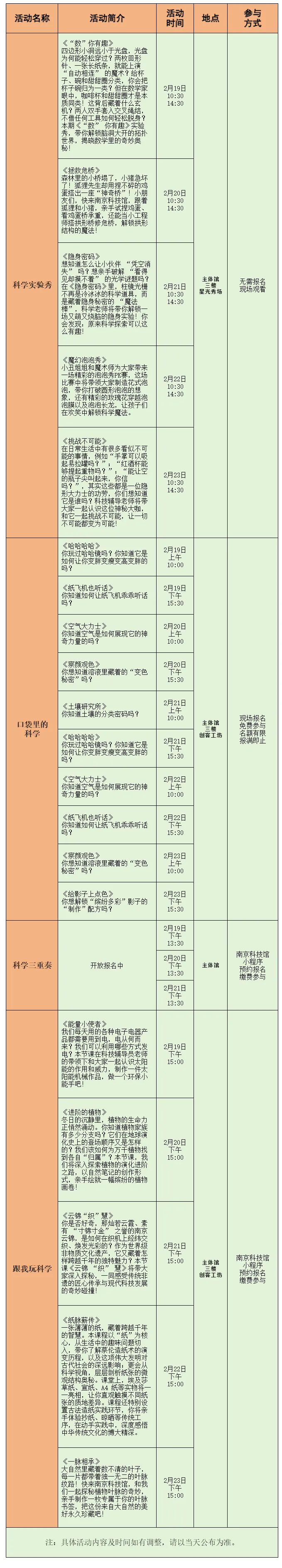 2月19日至23日开馆期间车辆9:30至17:00可停放至南京科技馆南北门停车场、郁金香路苏豪国际停车场、雨花大道紫荆花路至雨花南路东西两侧、雨花大道紫荆花路至郁金香路西侧临时停放点。