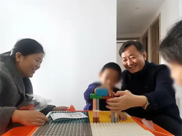 晟晟的每一点成长,不仅离不开主诊医生的专业诊疗,更离不开康复师的悉心陪伴与指导。朱梦伟作为晟晟的专属康复师,始终用耐心、爱心与责任心,陪伴孩子走过康复路上的点点滴滴。此次见面,晟晟对她也格外亲近,主动上前打招呼、拉着手撒娇。互动期间,朱梦伟陪着晟晟玩起了积木,轻声询问他喜欢积木里的哪个部件,晟晟不假思索地回答:“我最喜欢长颈鹿和大象。”轻松愉悦的玩耍氛围中,朱梦伟顺势开展家庭康复训练指导,一边陪孩子互动,一边向晟晟妈妈讲解训练技巧,让家长直观掌握家庭康复的方式方法,以便在家中更好地辅助孩子巩固康复效果。这一暖心举措,也生动践行了南京天佑儿童医院“医康教”相结合的康复理念,将专业的康复指导送到家,打破医院与家庭的壁垒,全方位助力孩子更快、更好地康复。
