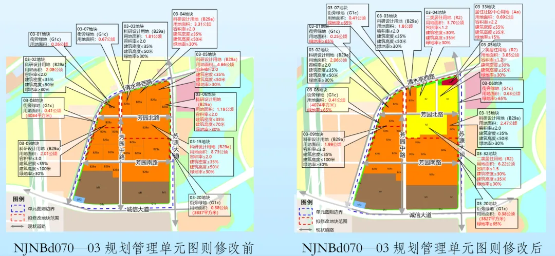 1、将原03-04、03-05、03-06地块科研设计用地(B29a)调整为03-04、03-05地块二类居住用地(R2),03-06地块街旁绿地(G1c)和03-33地块居住社区中心(Aa);