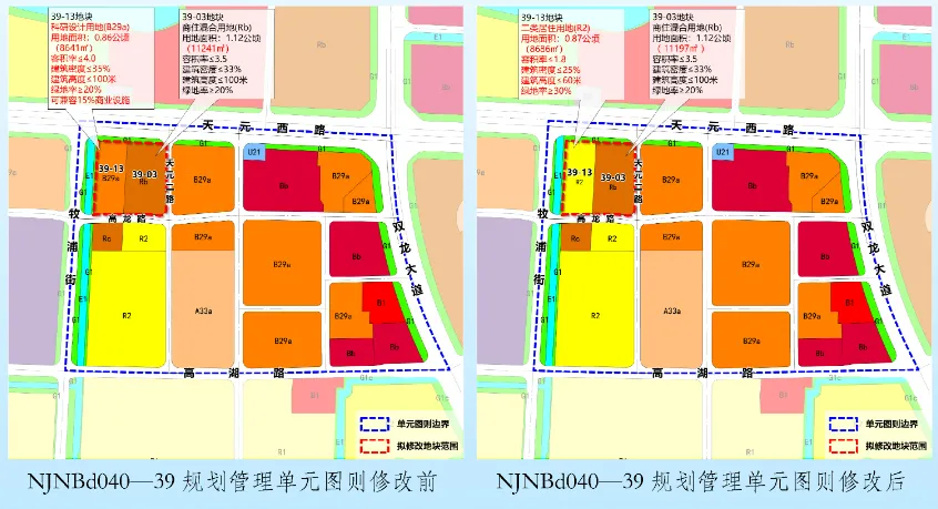 将39-13地块用地性质由科研设计用地(B29a)调整为二类居住用地(R2),指标调整为:用地面积为0.87公顷,容积率≤1.8,建筑高度≤60米,建筑密度≤25%,绿地率≥30%;
