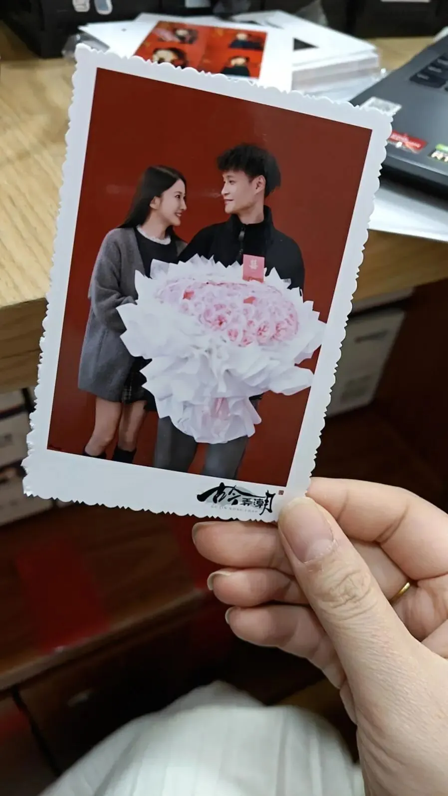 (现场工作人员为新人们送上免费纪念照)