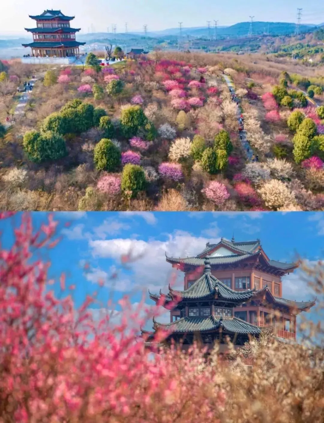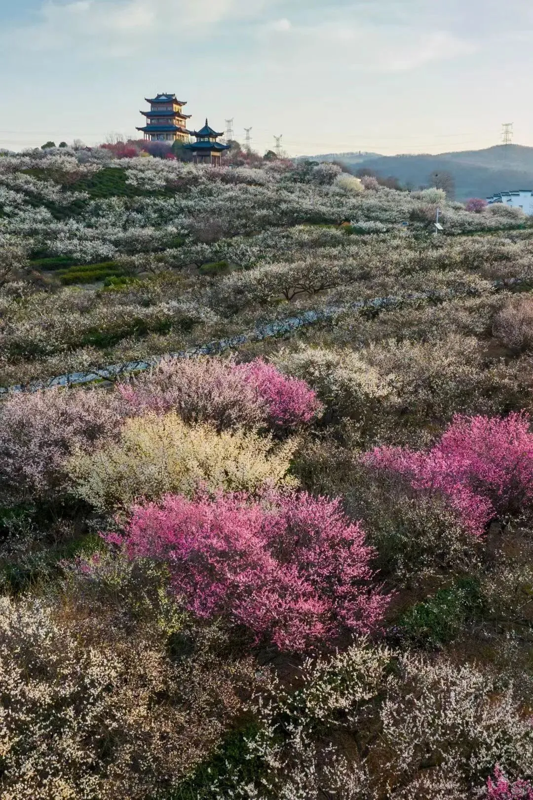 山顶最高处的赏梅阁,可以俯瞰整座梅花山,梅若烟霞,云蒸霞蔚,红梅如锦似霞,白梅高洁素雅,绿萼梅清绝孤傲,玉蝶梅幽香环绕……红的、白的、粉的,交织成一幅醉人的油画。