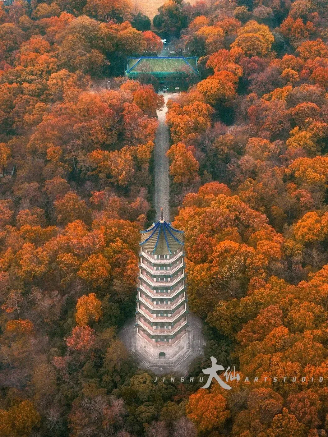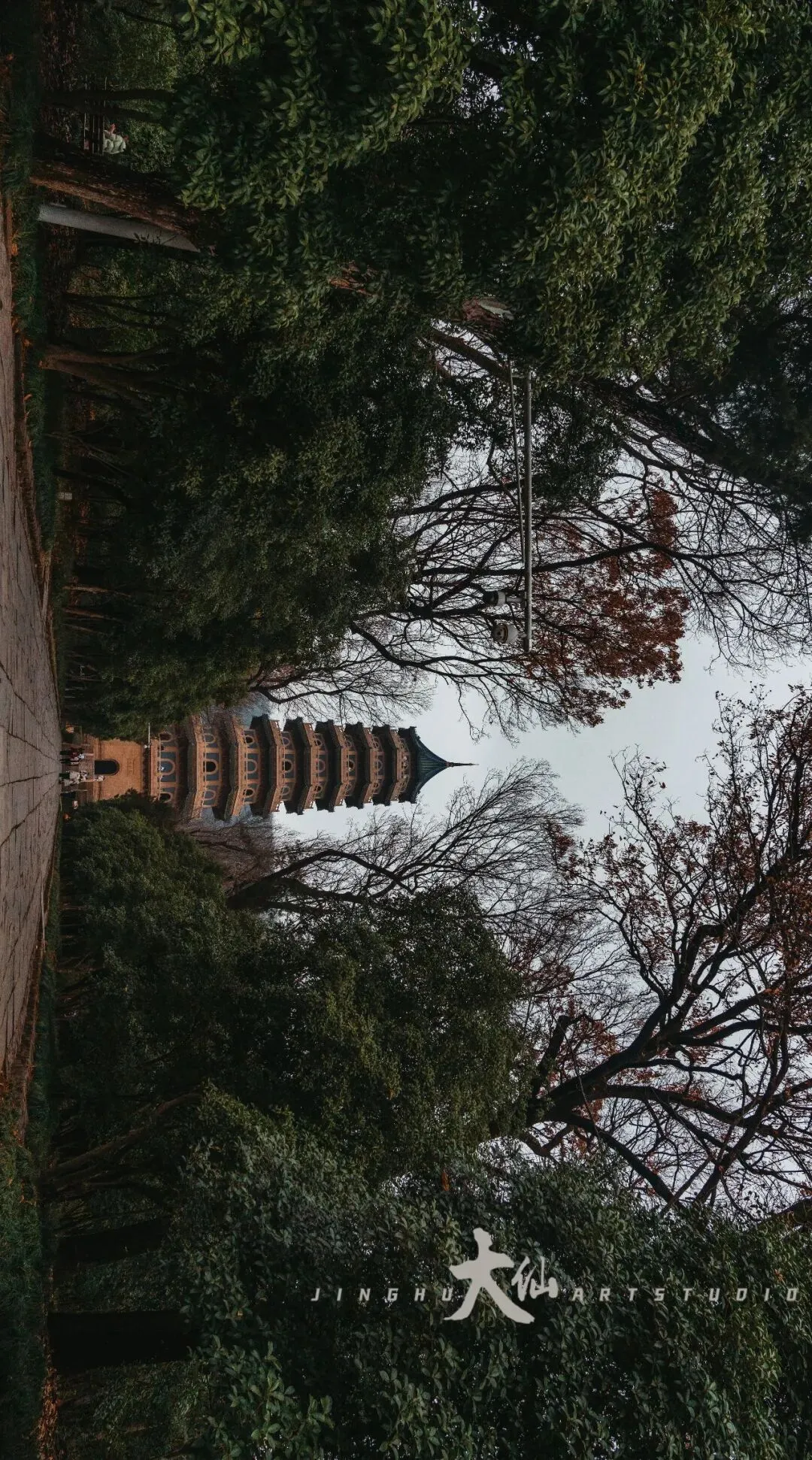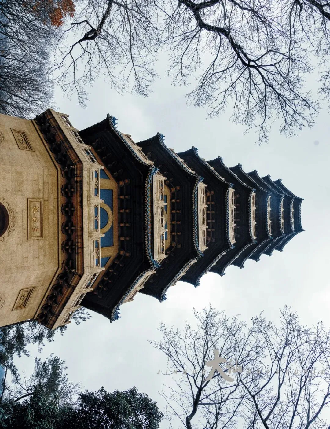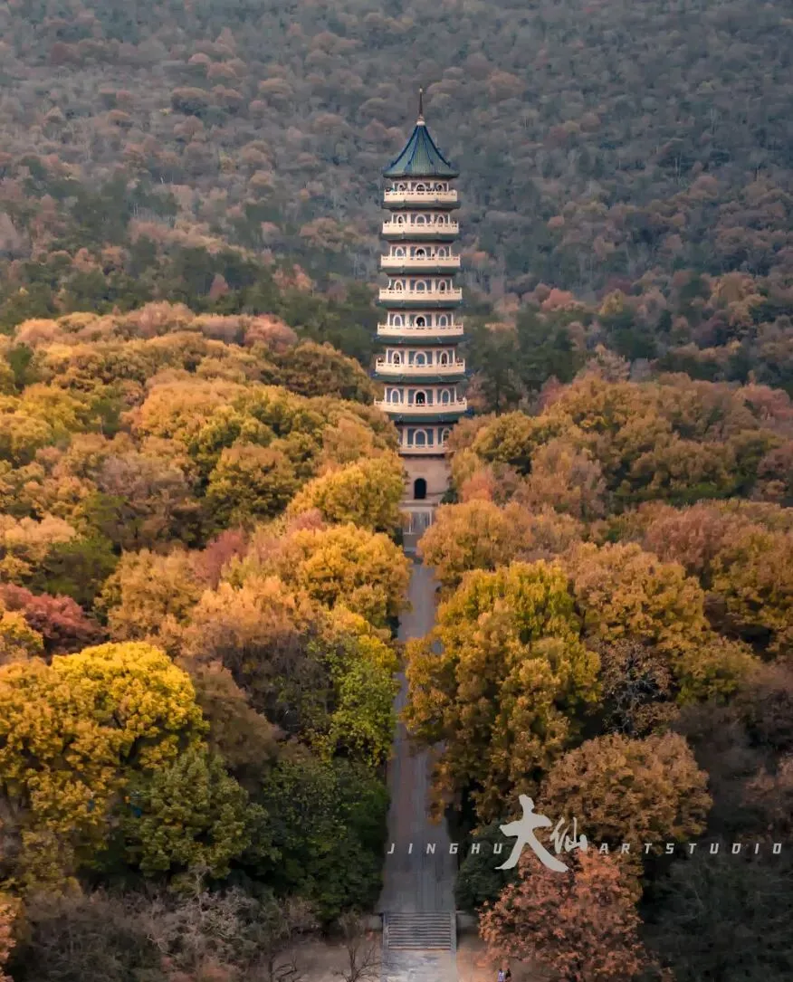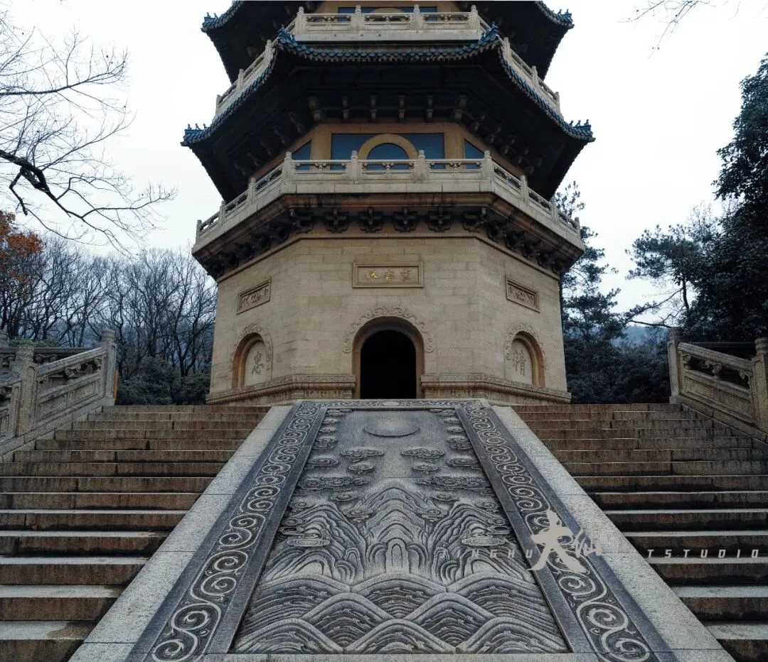 而无梁殿,这座明代灵谷寺唯一幸存的原构建筑,更是将这份铭记深深镌刻进砖石之中。作为通体不施寸木、无梁无柱的砖石拱券建筑,它在1933年被改建为阵亡将士公墓祭堂,殿内四壁镶嵌着110块太湖青石碑,上面工整镌刻着33224名阵亡将士的姓名,一笔一画,皆是忠魂,字字句句,皆为铭记。无梁殿之后,便是灵谷塔——原名国民革命军阵亡将士纪念塔,九层八面的钢筋混凝土仿古建筑,高耸入云,如同一座不朽的丰碑,承载着“精忠报国”的赤诚,也寄托着后人对先烈的深切缅怀。我镜头下的灵谷塔,有远景的巍峨挺拔,有近景的细节肌理,亦有登顶后俯瞰林海、回望古寺的壮阔俯视图,每一张画面,都藏着这座古塔与古寺的厚重与深情。