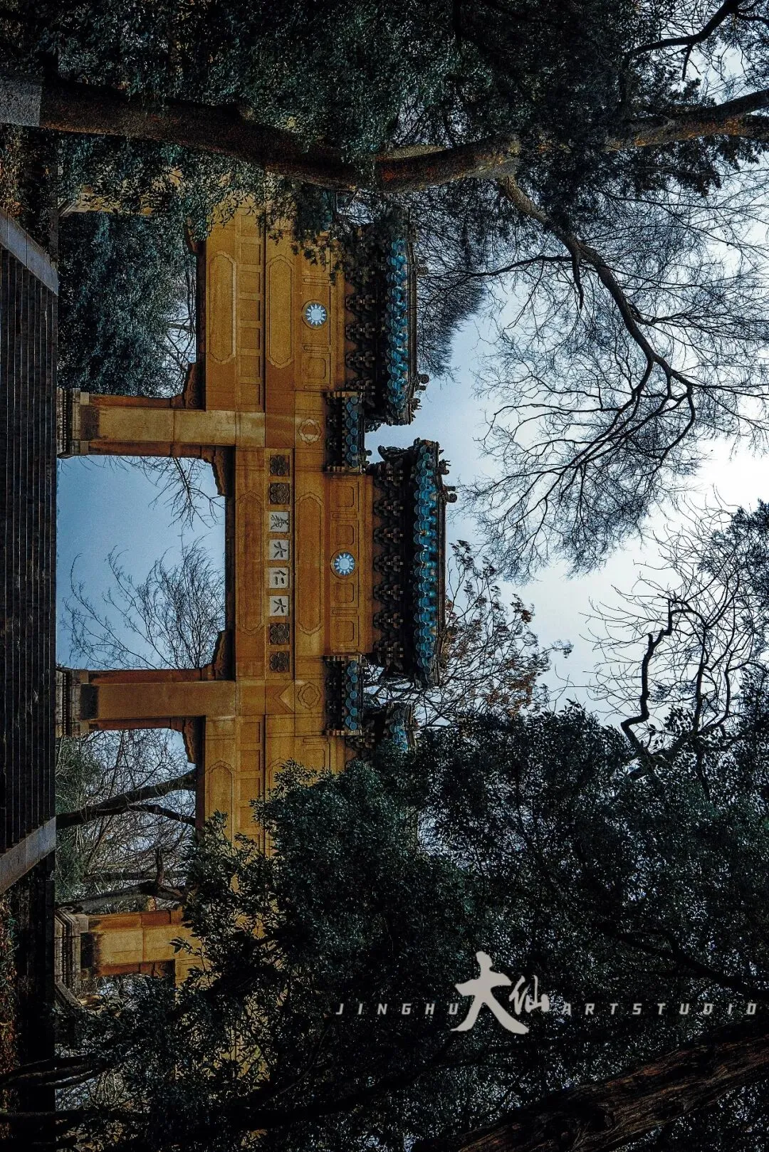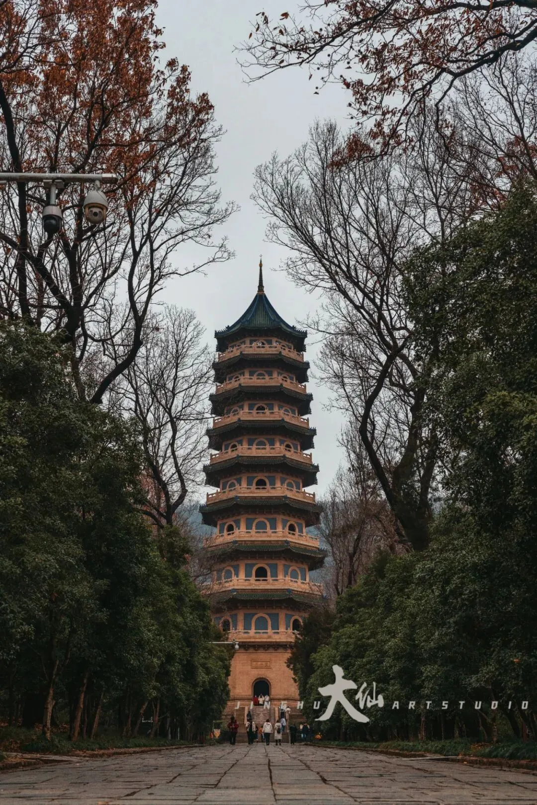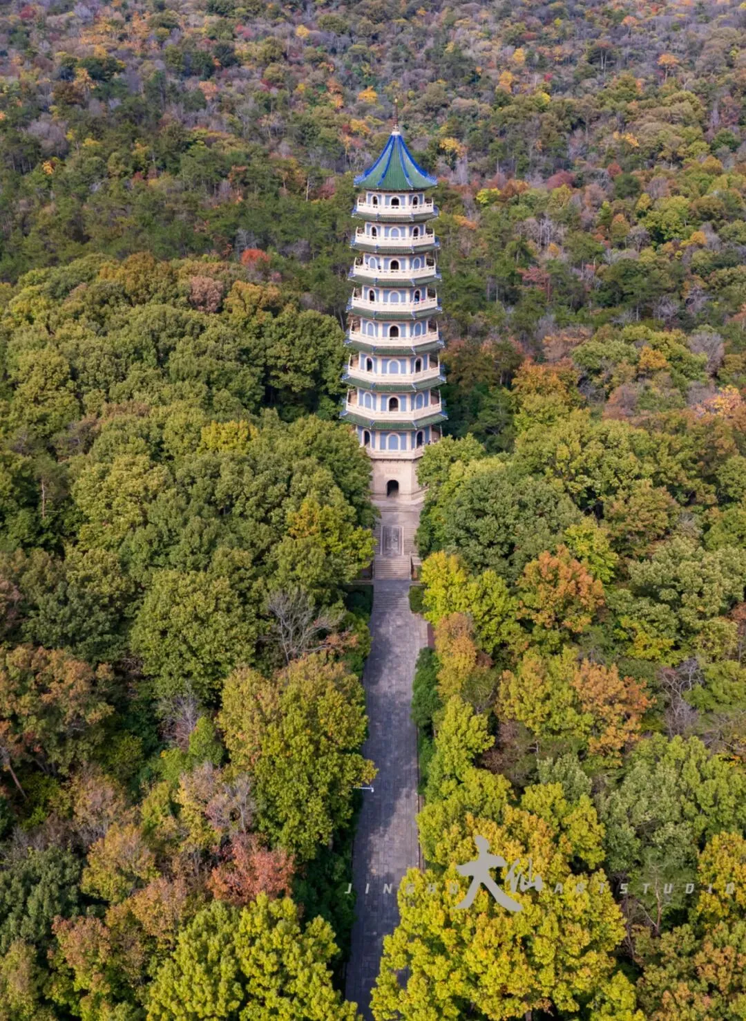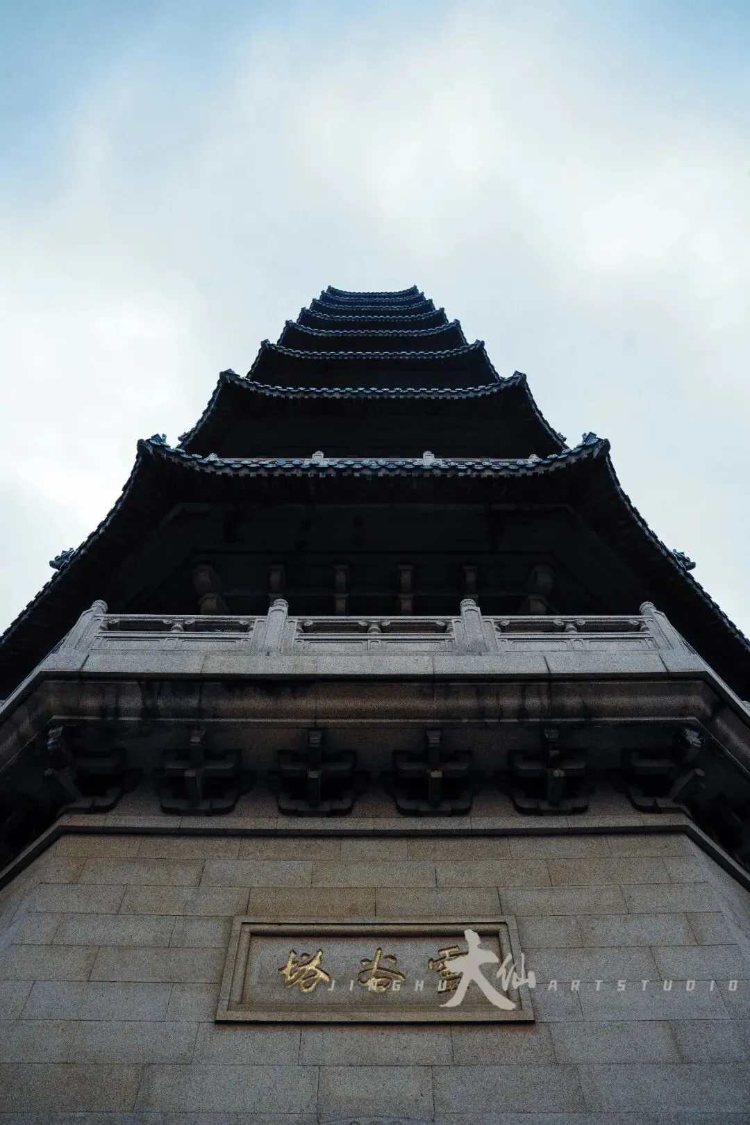 而无梁殿,这座明代灵谷寺唯一幸存的原构建筑,更是将这份铭记深深镌刻进砖石之中。作为通体不施寸木、无梁无柱的砖石拱券建筑,它在1933年被改建为阵亡将士公墓祭堂,殿内四壁镶嵌着110块太湖青石碑,上面工整镌刻着33224名阵亡将士的姓名,一笔一画,皆是忠魂,字字句句,皆为铭记。无梁殿之后,便是灵谷塔——原名国民革命军阵亡将士纪念塔,九层八面的钢筋混凝土仿古建筑,高耸入云,如同一座不朽的丰碑,承载着“精忠报国”的赤诚,也寄托着后人对先烈的深切缅怀。我镜头下的灵谷塔,有远景的巍峨挺拔,有近景的细节肌理,亦有登顶后俯瞰林海、回望古寺的壮阔俯视图,每一张画面,都藏着这座古塔与古寺的厚重与深情。