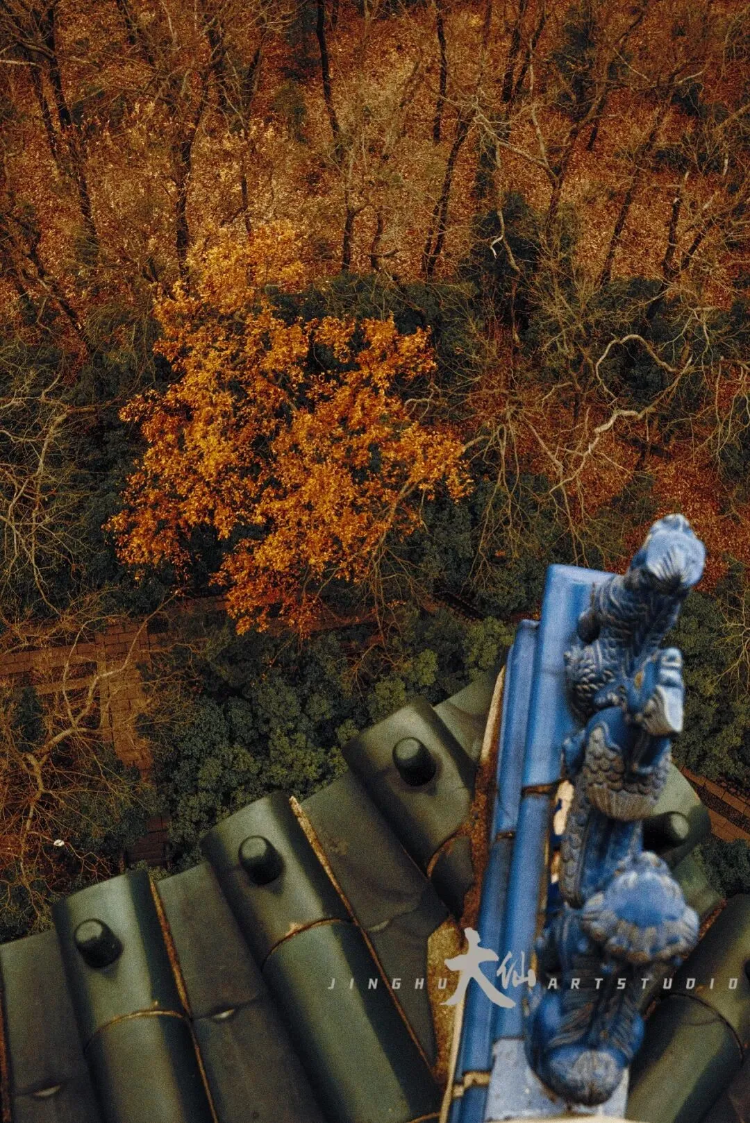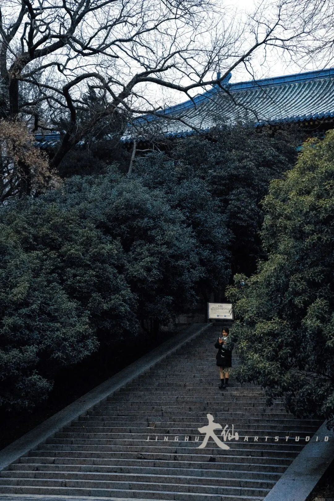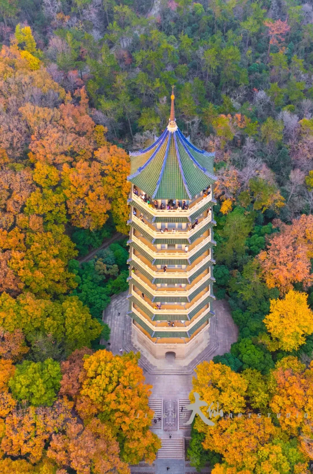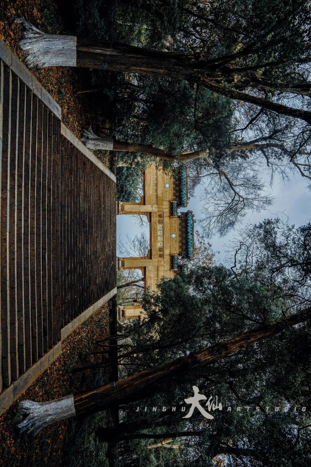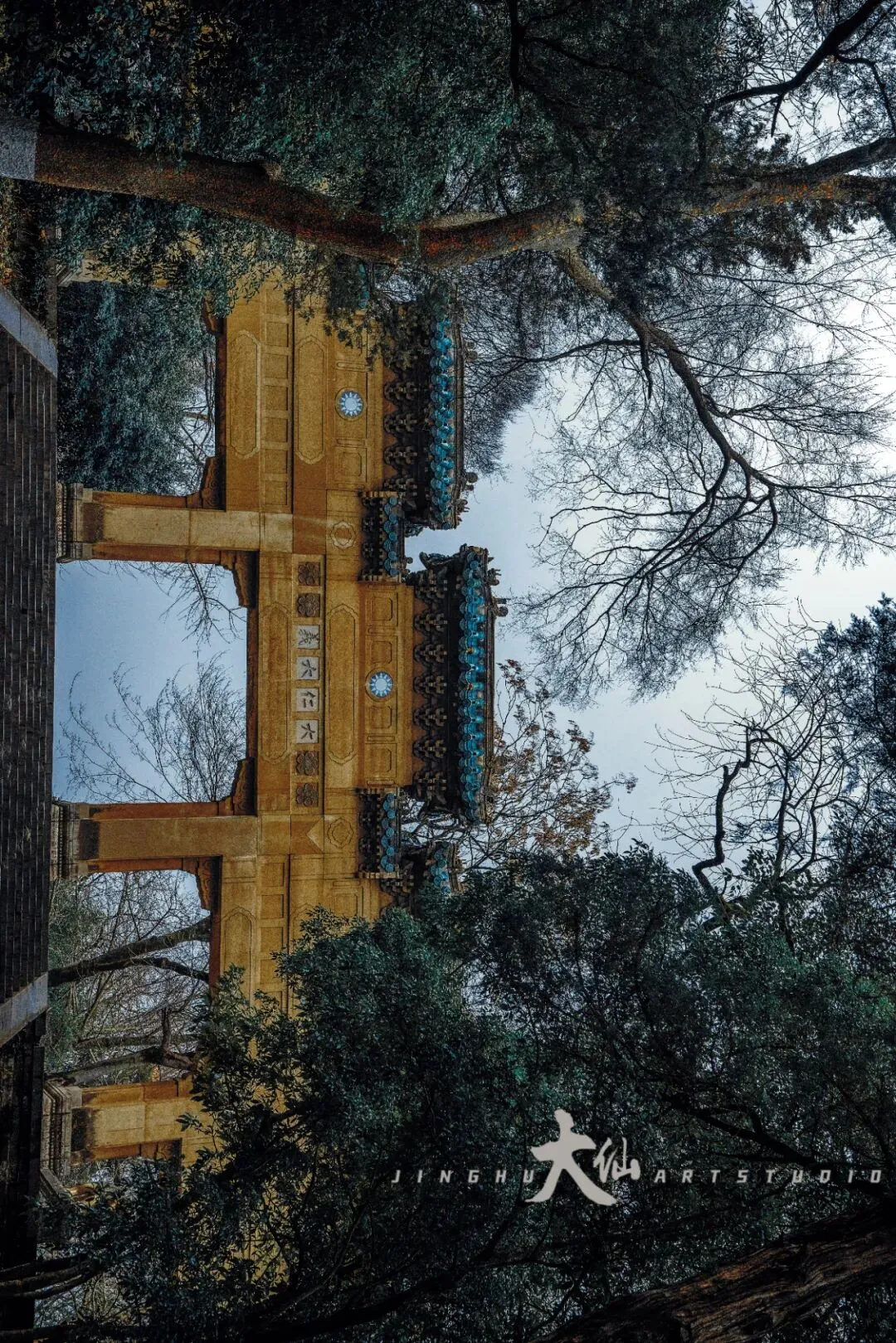 而无梁殿,这座明代灵谷寺唯一幸存的原构建筑,更是将这份铭记深深镌刻进砖石之中。作为通体不施寸木、无梁无柱的砖石拱券建筑,它在1933年被改建为阵亡将士公墓祭堂,殿内四壁镶嵌着110块太湖青石碑,上面工整镌刻着33224名阵亡将士的姓名,一笔一画,皆是忠魂,字字句句,皆为铭记。无梁殿之后,便是灵谷塔——原名国民革命军阵亡将士纪念塔,九层八面的钢筋混凝土仿古建筑,高耸入云,如同一座不朽的丰碑,承载着“精忠报国”的赤诚,也寄托着后人对先烈的深切缅怀。我镜头下的灵谷塔,有远景的巍峨挺拔,有近景的细节肌理,亦有登顶后俯瞰林海、回望古寺的壮阔俯视图,每一张画面,都藏着这座古塔与古寺的厚重与深情。