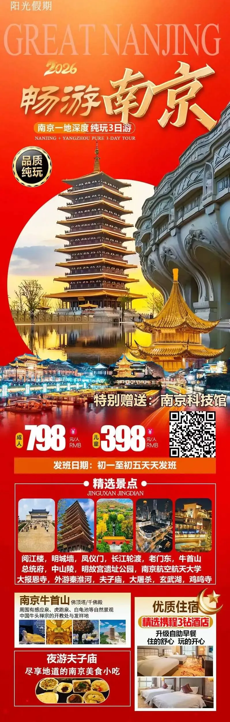 早规定时间集合出发,乘车赴南京(约7小时)早指定地点集合出发南京后游览【阅江楼】(游览时间1小时),位于南京长江之畔,中国十大文化名楼之一,它与武汉黄鹤楼,江西滕王阁,湖南岳阳楼并称中国四大名楼,有“江南第一楼”之称。登临楼顶,气象万千,一览长江雄壮景象和南京标志性建筑长江大桥。阅江楼喻阅江揽胜之意,楼高五十二米多,外四层暗三层,共七层,碧瓦朱楹、檐牙摩空、朱帘凤飞、彤扉彩盈,具有鲜明的古典的皇家气派,为典型的明代皇家建筑风格。后游览【南京明城墙】世界现存规模最大、最长保存原真性最好的古代城垣【南京明城墙】主要参观仪凤门—挹江门段,游走在600年前的城墙上,仿佛历史就在身边。登临【仪凤门】南京明城墙十三座明代京城城门之一,又称兴中门,位于南京市鼓楼区下关狮子山南麓与绣球山之间,坐东朝西,与钟阜门在不足一公里的地段项背而建,呈龙凤呈祥之形胜,现为阅江楼景区重要组成部分。漫步明朝城墙之上,触摸600年前的城砖,聆听明朝城墙建造的历史与故事,不由感慨古人的智慧与力量。后赠送乘坐游览【浦口火车站】后乘坐【长江轮渡】前往中山码头临江路5号(长江北岸),是一座轮渡码头,常年开行驶往对岸中山码头(又称下关码头)的轮渡,浦口码头与浦口火车站相连。推荐打卡点(自由活动时可根据自身情况打卡):1.百年雨廊:弧形拱廊是朱自清《背影》中父亲买橘子的场景取景地,铸铁立柱与木质顶棚构成。2.浦口火车站月台:保留完好的旧式站台、铁轨及“南京北站”牌匾,适合拍摄怀旧风或文艺片。3.中山码头-浦口航线:甲板栏杆处与长江大桥同框。后逛【老门东】老门东是南京老城南地区的古地名,位于南京夫子庙箍桶巷南侧一带。历史上的老城南是南京商业及居住最发达的地区,如今按照传统样式复建木质建筑、马头墙,集中展示传统文化,再现老城南原貌。青砖黛瓦,粉墙小巷,老门东给游客的第一印象充满着时光的味道,纪念品店里的文艺小物,问渠茶社里的袅袅茶香,街边凉亭里身着旗袍的姑娘们指间弹奏的琴音,还有周边传出的人群的喧嚣声,都像胶片一样刻画在游客眼中。这里不仅有绚丽的花灯,迤逦的小巷,有趣的糖画、面塑、灯彩、箍桶等民间工艺,而且还开设了“南京味道”街区,并引进了蒋有记、蓝老大糖粥藕店、黄勤记凉粉、小郑酥烧饼、徐家鸭子店、鸡鸣汤包等“特色南京草根美食”。后前往酒店入住休息。早餐后游览【牛首山胜景】(游览约2.5h,独家赠送牛首山小交通),景区建设核心包括补天阙、藏地宫、修圣道、现双塔、兴佛寺、弘文化,依次代表修复山体生态,恢复牛首双阙;利用天然矿坑建佛顶宫,长期安奉佛骨舍利;扩建原有隧道,感悟八相成道,体验成佛之路;兴建佛顶塔,重现历史双塔格局;弘五叶禅院,感悟人间山水禅意。后游览中国近代史博物馆【总统府】(游览时间1.5小时)南京总统府位于南京市玄武区长江路292号,是中国近代建筑遗存中规模最大、保存最完整的建筑群,也是南京民国建筑的主要代表之一,现已辟为中国近代史遗址博物馆。1912年1月1日,孙中山在此宣誓就职中华民国临时大总统,辟为大总统府,后来又为南京国民政府总统府。南京总统府自近代以来,多次成为中国政治军事的中枢、重大事件的策源地,现已列为全国重点文物保护单位,国家AAAA级旅游景区。参观中山陵梧桐大道,路况允许的情况下导游会步行带着大家去感受一下梧桐大道得美!!!让大家不虚此行。后参观【中山陵】(游览时间1.5小时)包括博爱坊、墓道、陵门、碑亭、祭堂和墓室等建筑。中山陵是孙中山的陵墓,陵墓的入口有孙中山手书的“博爱”两个金字。整个建筑群依山势而建,由南往北排列在一条中轴线上,墓地全局呈“警钟”形图案。钟山景交(中山陵景区)至25年10月起实行交通管制,工作日09:00-17:00,节假日、双休日08:30-17:30,这个时间段大巴车及机动车禁行,不能进景区,需乘景区接驳车前出中山陵,接驳车费用单趟10元/人,来回20元/人,敬请自理,车程约10分钟左右!后外观【明故宫遗址公园】所在的区域曾是明朝初期的皇宫,由朱元璋建立,后经历多次改建和破坏,最终在1421年明成祖朱棣迁都北京后,南京作为留都,皇宫逐渐衰落。现在的遗址公园主要是对原有皇宫遗址的保护和展示。公园内分布有午门城墙、石狮、内金水河、内金水桥、石照壁等大量文物遗址,以及奉天门、奉天殿、华盖殿、谨身殿等遗址,让游客能够直观地感受到明朝皇宫的历史氛围。公园选址于山水之间,人工与自然交相辉映,绿化种植品种繁多,园林生态环境良好,形成了独特的自然古朴的景观。公园不仅是历史文化的展示地,也是市民休闲的好去处,提供了怀古的空间和优美的环境。后外观【南京航空航天大学】(Nanjing University of Aeronautics and Astronautics),简称“南航(缩写:NUAA)”,位于江苏省南京市,是由国家举办的普通高等学校,隶属于中华人民共和国工业和信息化部,具有航空航天民航特色的高水平研究型大学.学校是国家“双一流”建设高校,是“211工程”、“985工程优势学科创新平台”重点建设高校。后游览【大报恩圣地】(约60分钟左右,香火券20元/人自理)遗址被国家文物局专家组誉为“规格最高、规模最大、保存最完整的中国古代寺庙遗址”,今天来到园区可探寻600年前的香水河、香水河桥、永乐碑、宣