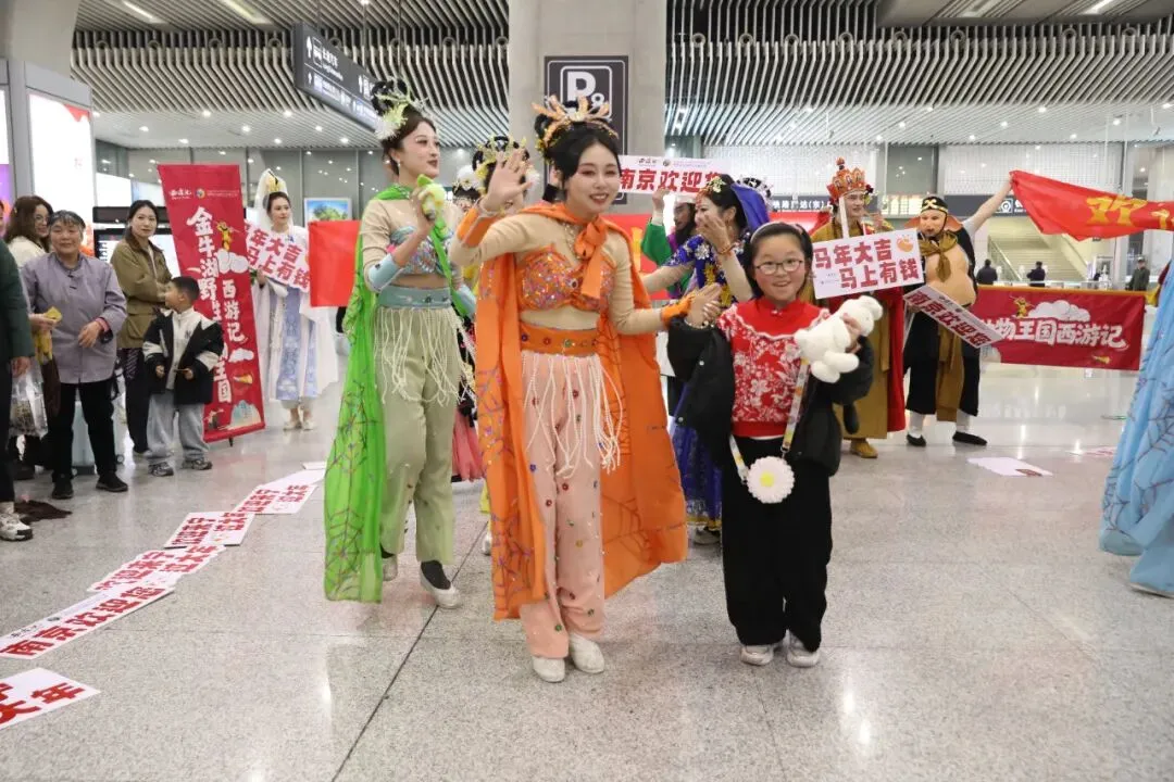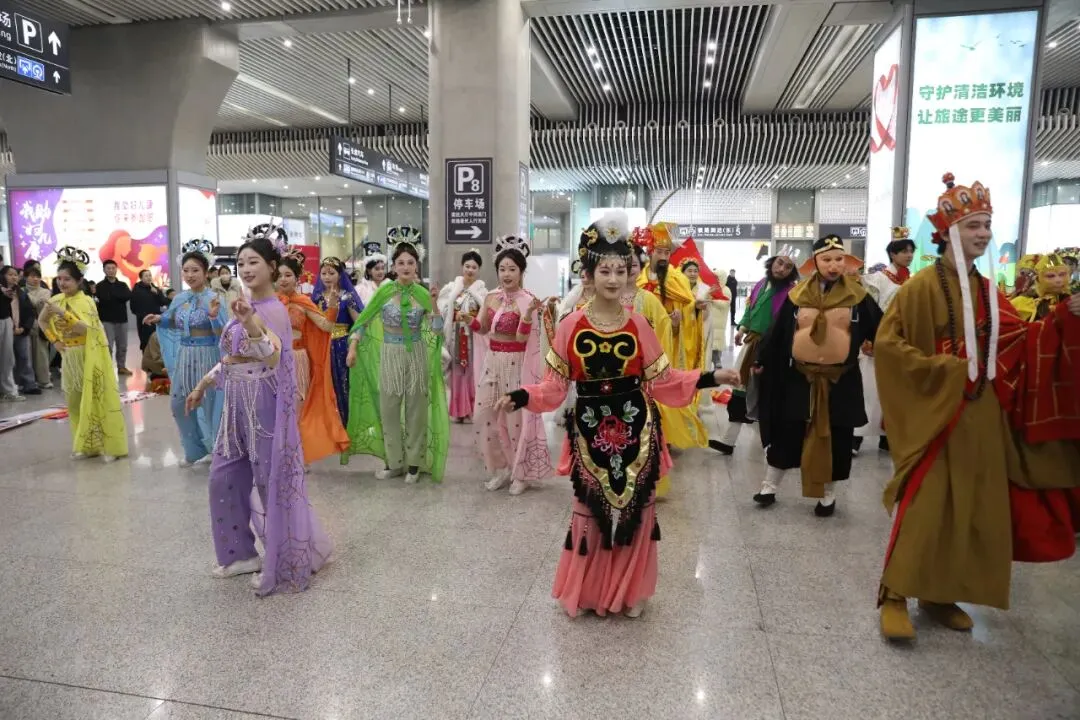 “猴王出世”再现石猴腾空的灵动洒脱,“蜘蛛精舞蹈”身姿曼妙、灵动俏皮,“三圣战三妖”还原经典名场面,还有《敢问路在何方》大合唱、“相亲相爱”团圆舞,让五湖四海的旅客,在南京南站就能沉浸式感受六朝文脉的厚重与西游传奇的趣味碰撞,把旅途的疲惫,都化作团圆的喜悦。