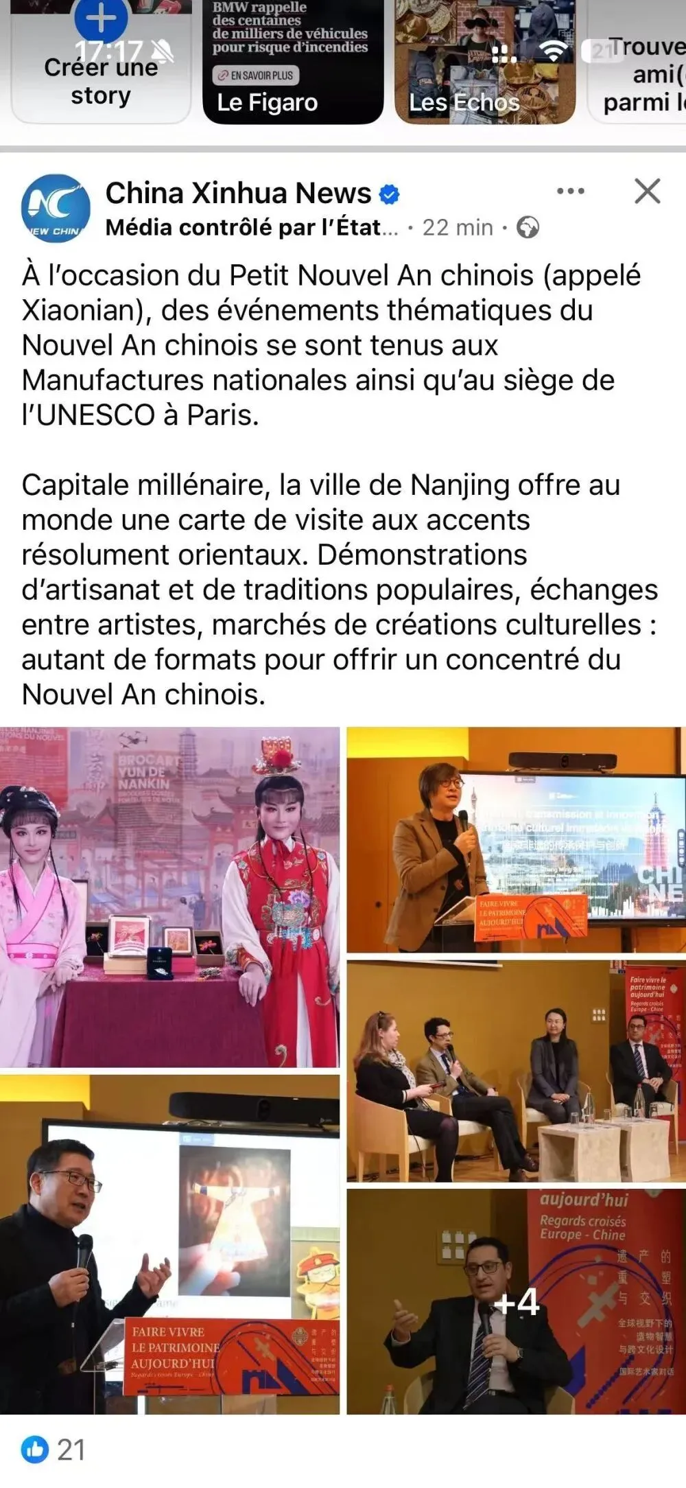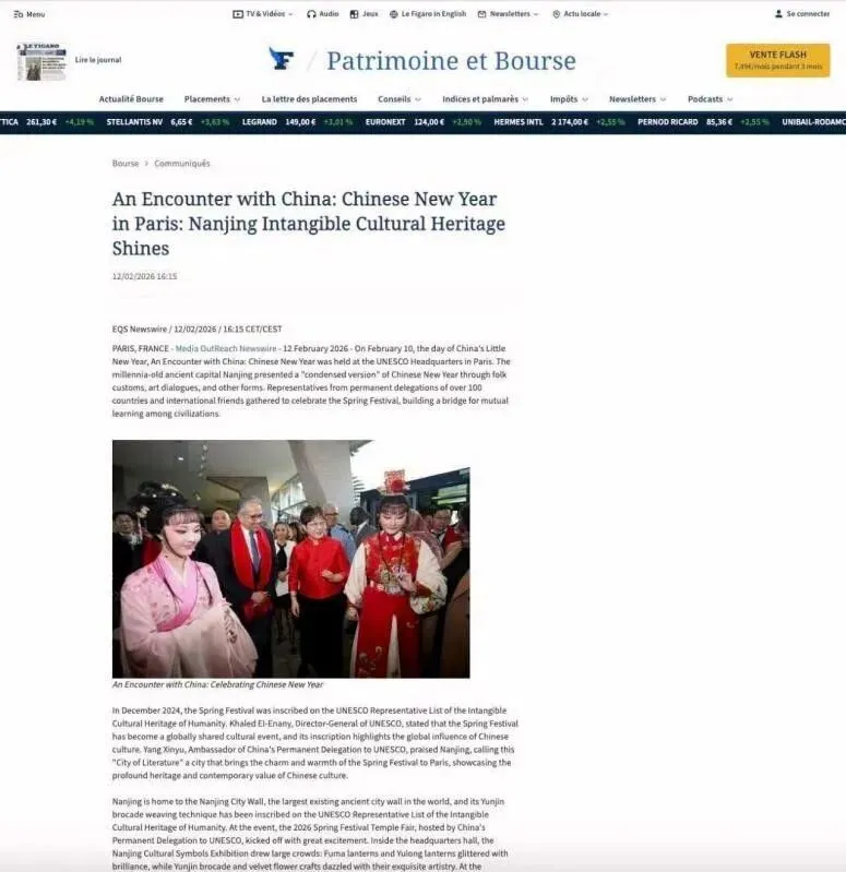 2月12日,美联社、法国《费加罗报》《普罗旺斯报》,亚洲新闻台、英国《金融时报》等180余家海外主流媒体,新华社海外社交媒体法语账号关注报道,浓浓的中国年味从秦淮河畔飘至塞纳河、传向世界。