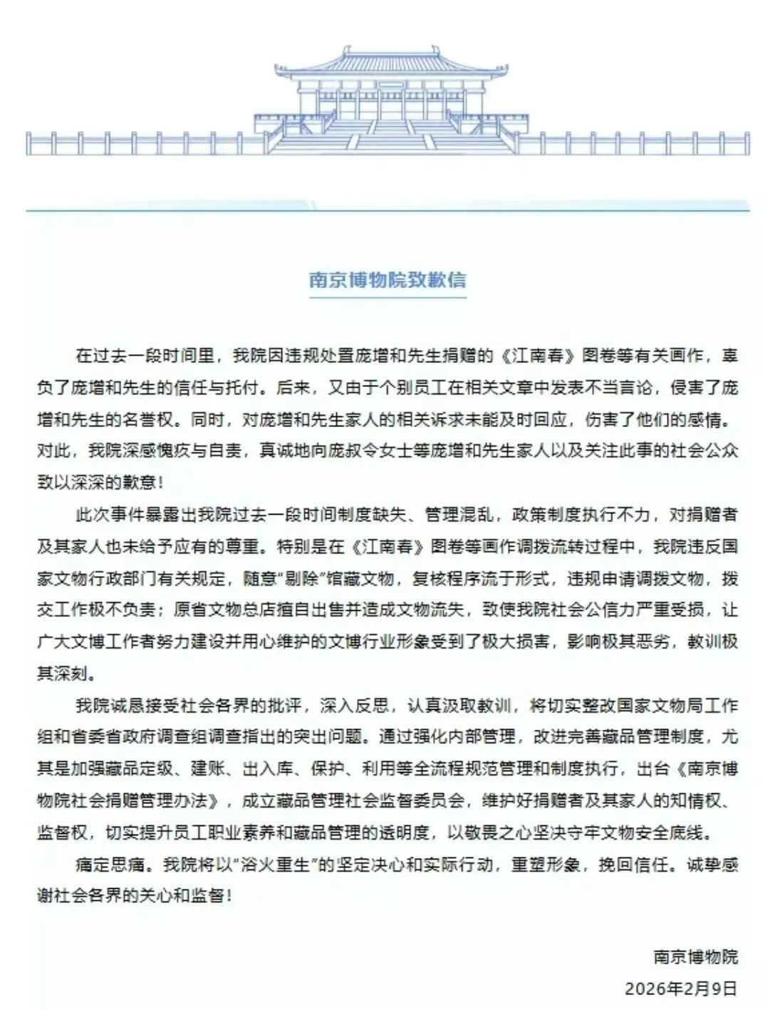 南京博物院这场关于捐赠文物的风波,从家族内部的质问和诉讼开始,随后演变为全国关注的公共舆论事件,最终以省级调查组介入与院方公开致歉落下帷幕。从内部事件到公共事件,从私域到公域,网络舆论监督并非一蹴而就,而是经历了阶梯式的深化。