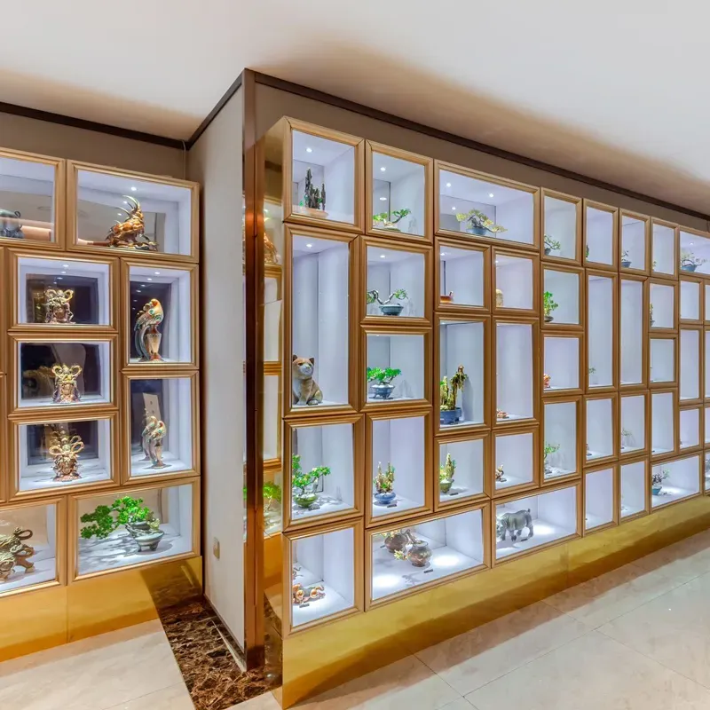 在大堂的多宝阁上,陈列着青松盆景、孙悟空下山等品类繁多的小型铜工艺品,犹如一个小型博物馆。
