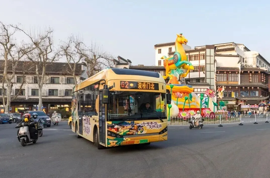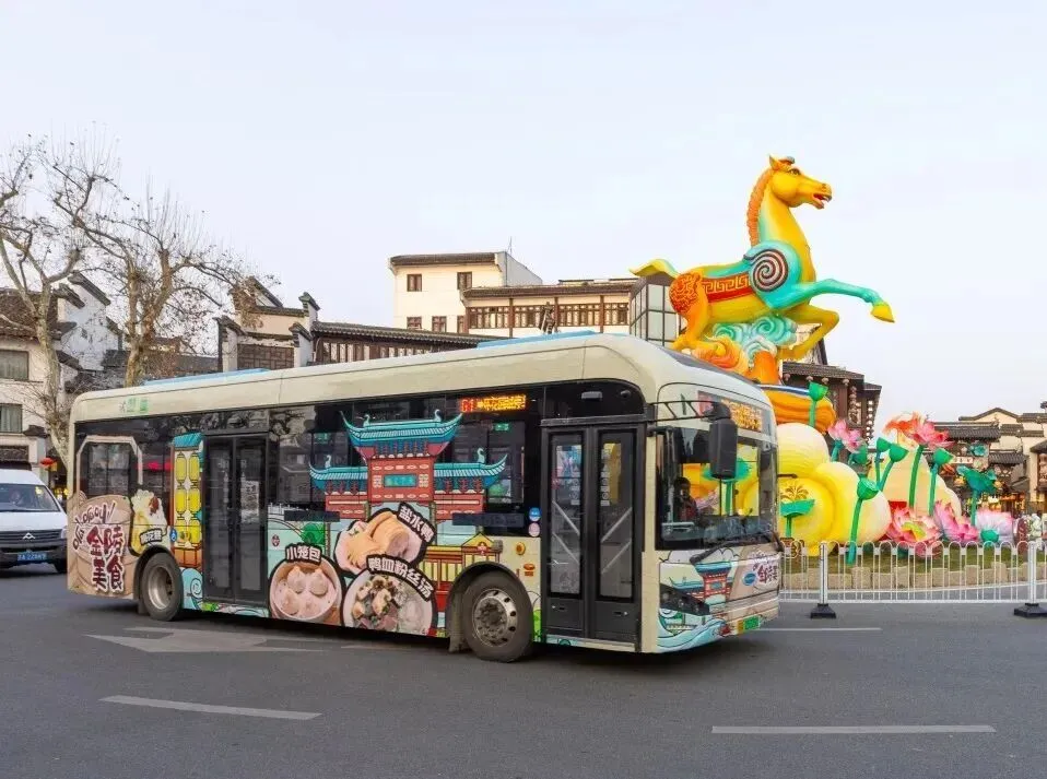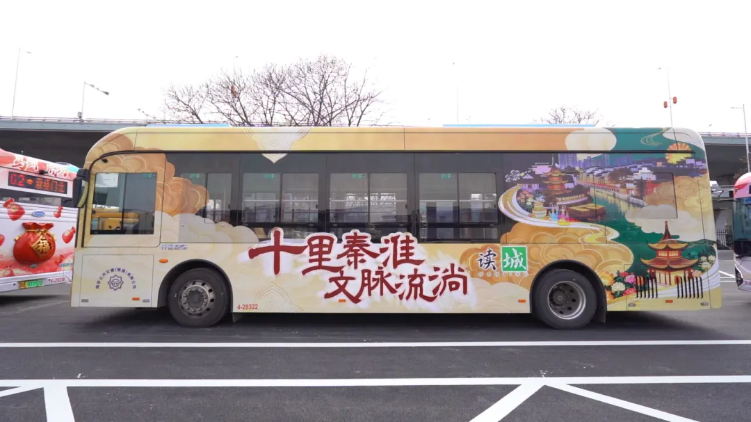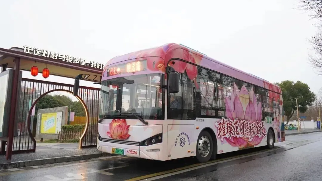 秦淮灯彩,不止于年节的璀璨,公交车化作流动的灯河,车头荷花亭亭,车厢花影婆娑,仿佛将夫子庙的桨声灯影牵引至寻常巷陌。