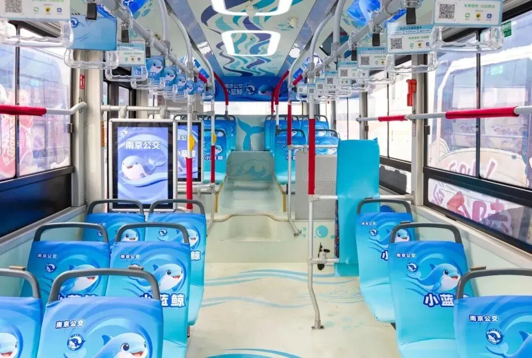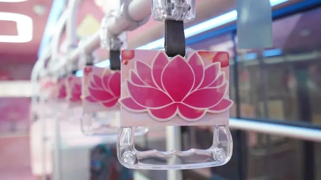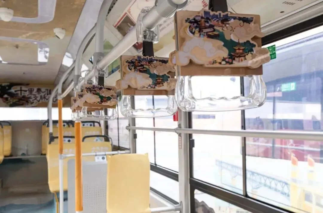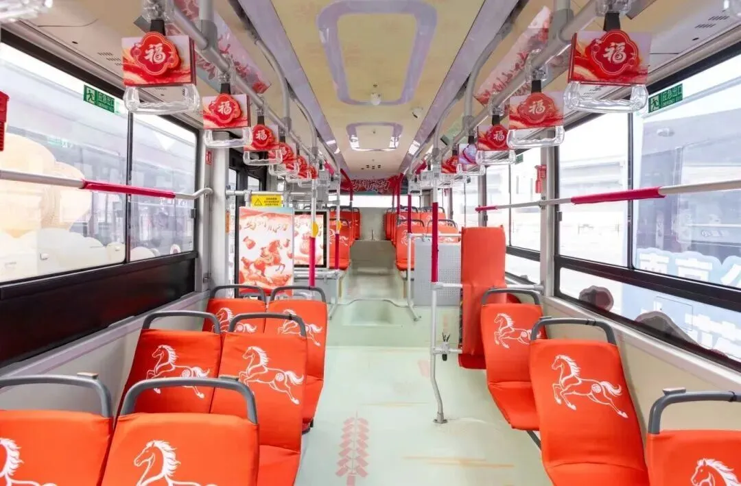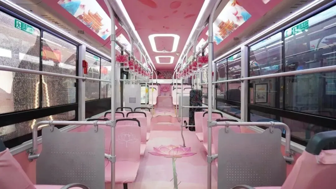 荷花灯纹层层铺展,拉手与座椅皆有花意,带着“张灯祈福”与“和和美美”的美好祝愿,将“灯影桨声”的诗意,从秦淮河畔延伸到了城市街巷,让市民乘客“行在灯中,享在车内”。