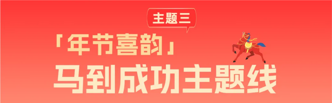 马到成功主题线,朱红与暖金交织的底色上,昂首奔腾的骏马身披鞍鞯,背负“福”字锦囊,周围点缀着福袋等吉祥元素,传统生肖文化顿时充满了新年的喜庆与活力。