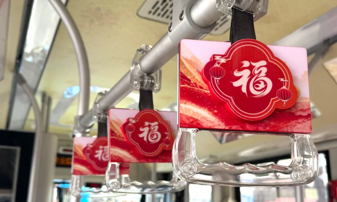 车厢拉手上的“福”字将新春的福气传送到每个人的手里,车头与车尾立体福袋的细节更让祝福随车而行,温暖整座城市。