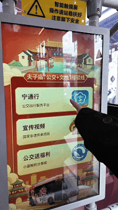车厢内的智慧化升级也进一步提升了读城体验。每辆主题专线均搭载可触摸智能屏。公交出行服务平台“宁通行”App、宣传视频介绍国家非遗传承项目、小蓝鲸积分商城,可随时点击查看。