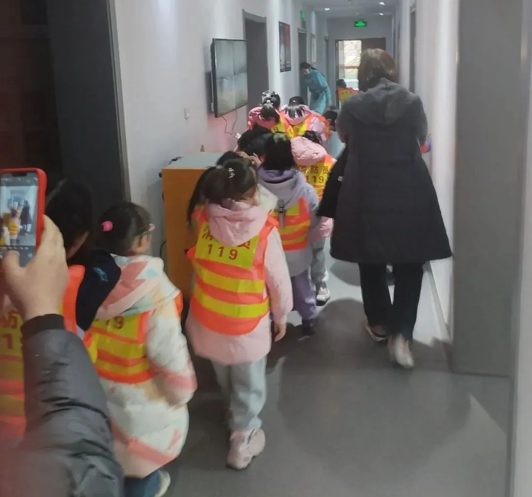 讲解老师告诉大家,火灾发生时,浓烟会向上蔓延,所以要弯腰在 1.2 米以下的高度撤离。同时,要用湿毛巾或衣袖捂住口鼻,用指尖轻摸墙壁指引方向,靠墙有序逃生。