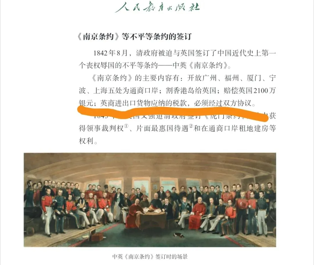 尽管《南京条约》中文本措辞委婉,但在当时的背景下,“秉公议定则例”实际上剥夺了中国自主制定关税的权力。英国通过后续的《五口通商章程》和《虎门条约》,将主要商品税率压低至 5%左右(“值百抽五”),并规定中国日后变更税则必须与英国协商。1844 年的中美《望厦条约》更是明确规定:“倘中国日后欲将税例变更,须与合众国领事等官议允”,这才是“协定关税”的法律化表达。教材将这一过程的最终结果浓缩到了对《南京条约》的解读中,以“中国方面须与英国商定”这一表述,一针见血地指出了中国关税自主权的丧失,是对历史本质的准确概括。