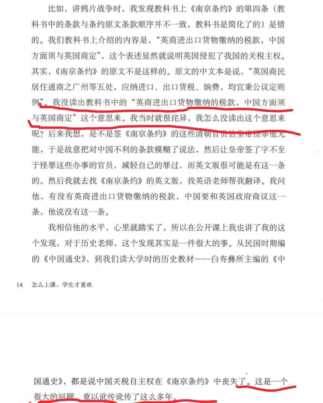 现行人教版八年级历史上册第一课《鸦片战争》中对《南京条约》的主要内容进行了介绍,其中第四条表述为:“英商进出口货物缴纳的税款,中国方面须与英国商定。”这一表述在魏勇老师所著的《怎么上课,学生才喜欢》中被提出质疑。魏勇老师认为,根据其对《南京条约》原文中文本的解读,原文中并没有体现出“中国方面须与英国商定”这一意思。原文中文本(第十款)为:“英国商民居住通商之广州等五处,应纳进口、出口货税、饷费,均宜秉公议定则例,由部颁发晓示,以便英商按例交纳。”从字面意思来看,似乎是要求清政府制定一个公平的税则并公开,让英商按例缴纳。英文本的表述是“establish a fair and regular Tariff”,即“建立一个公平、规范的税则”,同样没有直接出现“双方商定”的字眼。