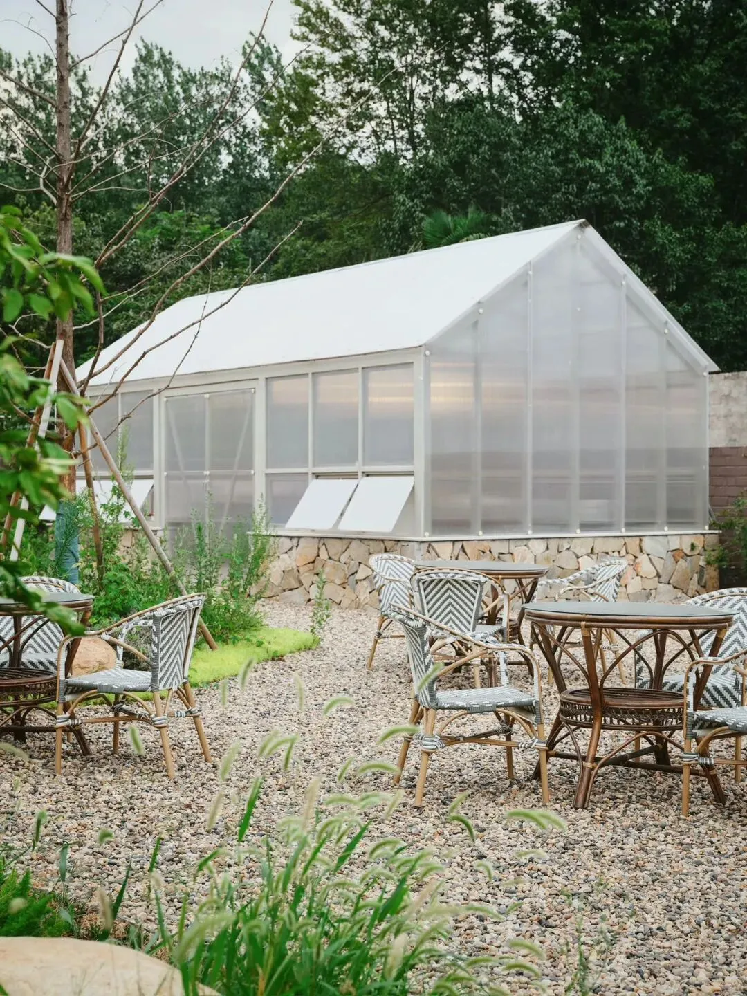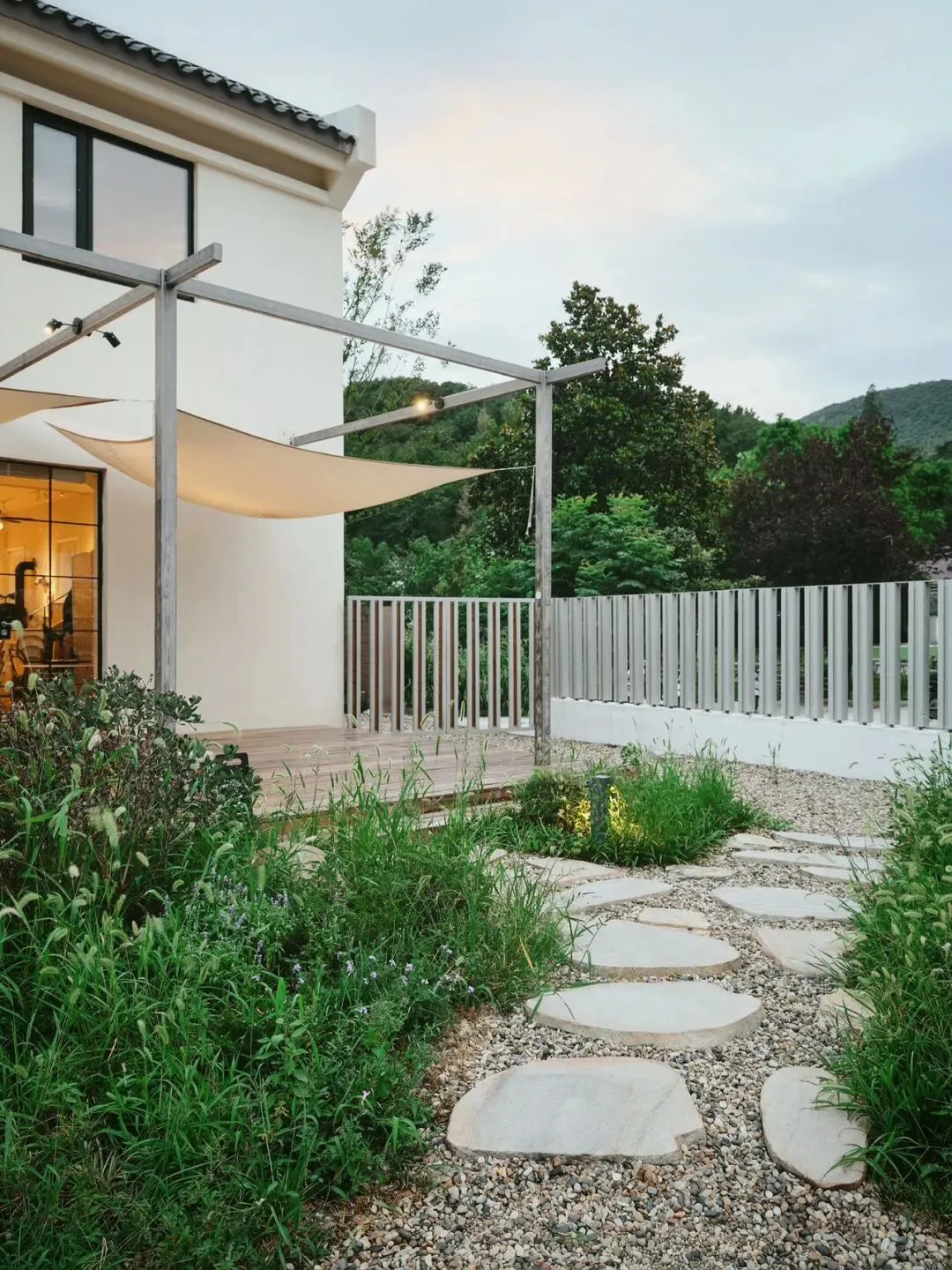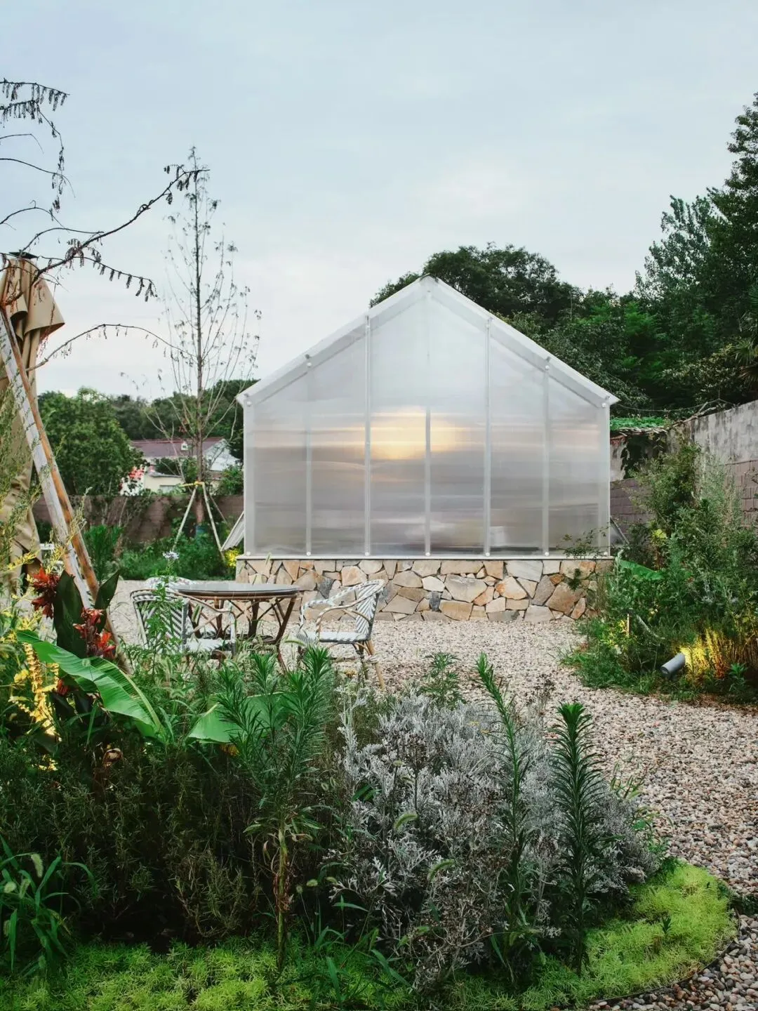 后院充分利用大空间优势,搭建一座花园温室,地面铺设细碎卵石,打造出统一而松弛的行走与停留界面。卵石之间点缀着自然生长的草本植物与低矮灌木,让硬质铺装与绿植柔和过渡,野趣与精致兼具。