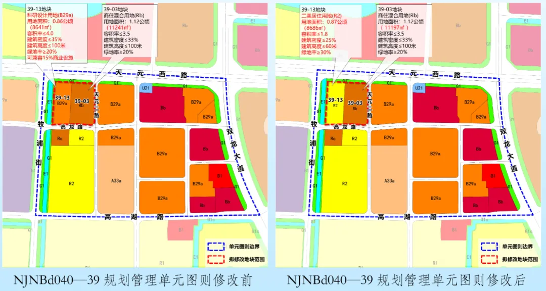 用地性质及控制指标调整。将39-13地块用地性质由科研设计用地(B29a)调整为二类居住用地(R2),指标调整为:容积率≤1.8,建筑高度≤60米,建筑密度≤25%,绿地率≥30%;结合权属优化相邻39-03地块边界,3903地块用地性质及控制指标保持不变。