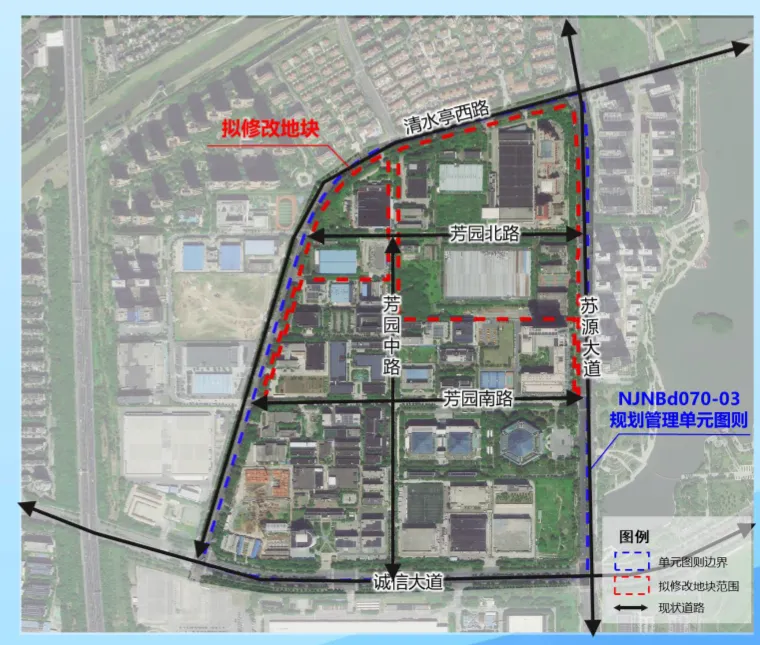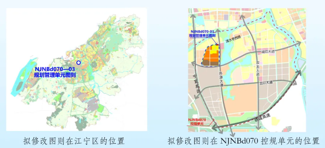 NJNBd070-03规划管理单元图则位于江宁九龙湖片区西北侧,东至苏源大道、西北至清水亭西路、南至诚信大道,用地面积约87.99公顷。