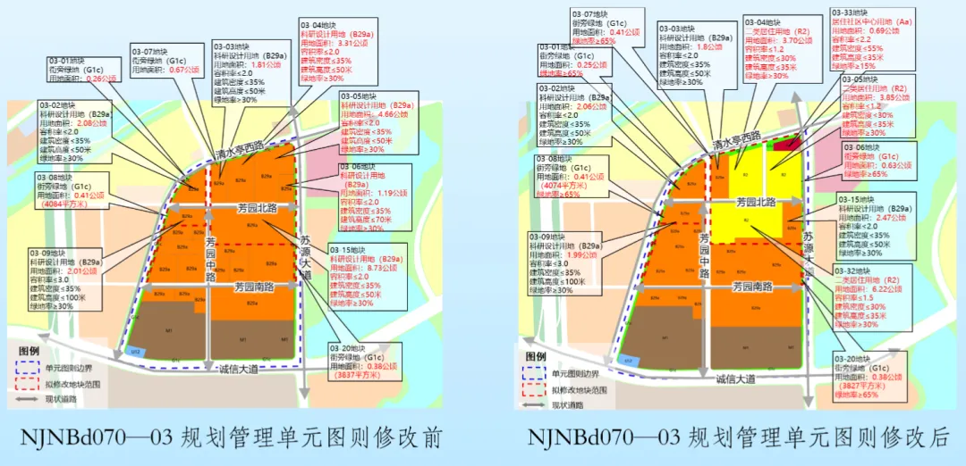 (二)用地性质及控制指标调整。将原03-04、03-05、03-06地块科研设计用地(B29a)调整为03-04、03-05地块二类居住用地(R2),03-06地块街旁绿地(G1c)和03-33地块居住社区中心(Aa);从原03-15地块切分出一幅二类居住用地(R2),地块编号为03-32;调整相关地块规划控制指标,同时结合道路调整和权属优化相邻用地边界。