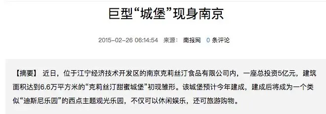 2018年江宁开发区网络发言人表示:南京克莉丝汀食品有限公司原计划建设甜蜜城堡工业旅游项目,并与苏州某烘焙学校等多家项目单位洽谈过投资事宜,但未能实现合作。因合作内容发生变故,且公司要求合作企业必须具有良好品牌和口碑,导致未能确定入驻项目,城堡开业有所延误。