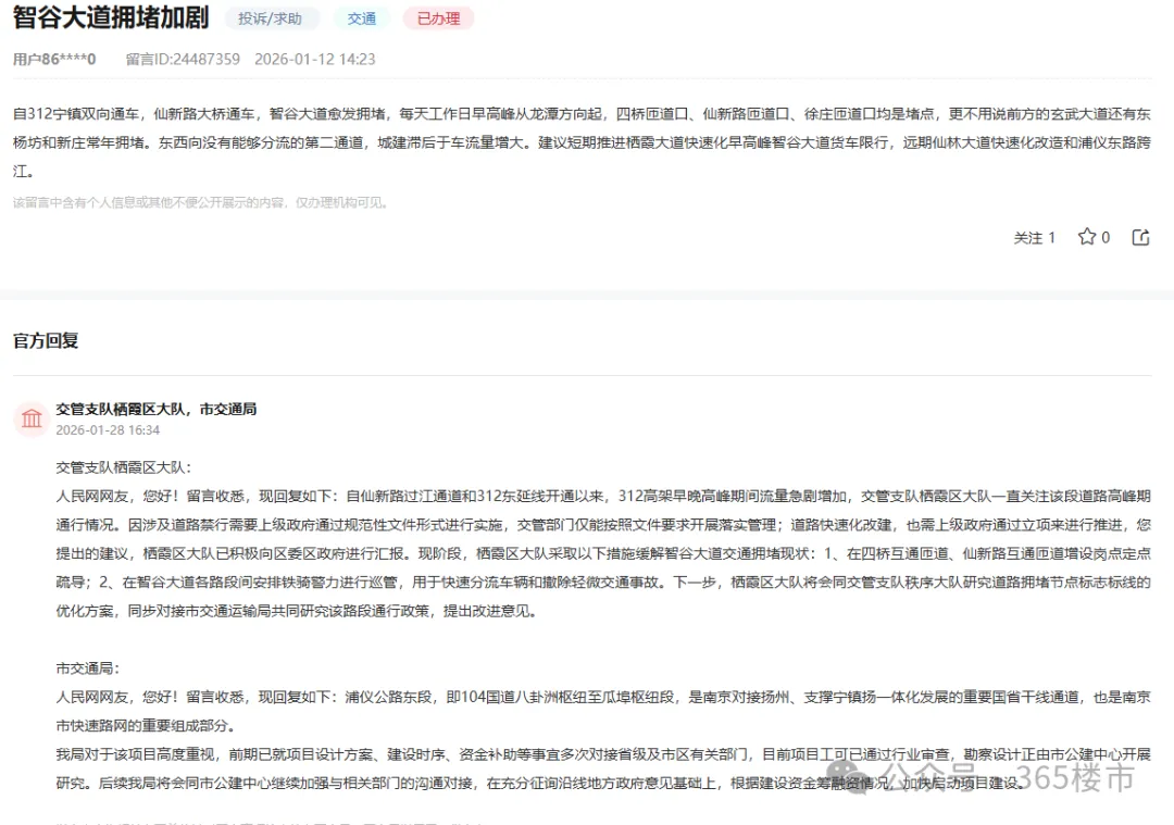 我在相关网站发现,有网友对智慧谷大道拥堵情况,以及浦仪公路东延情况进行问政:建议短期推进栖霞大道快速化早高峰智谷大道货车限行,远期仙林大道快速化改造和浦仪东路跨江。