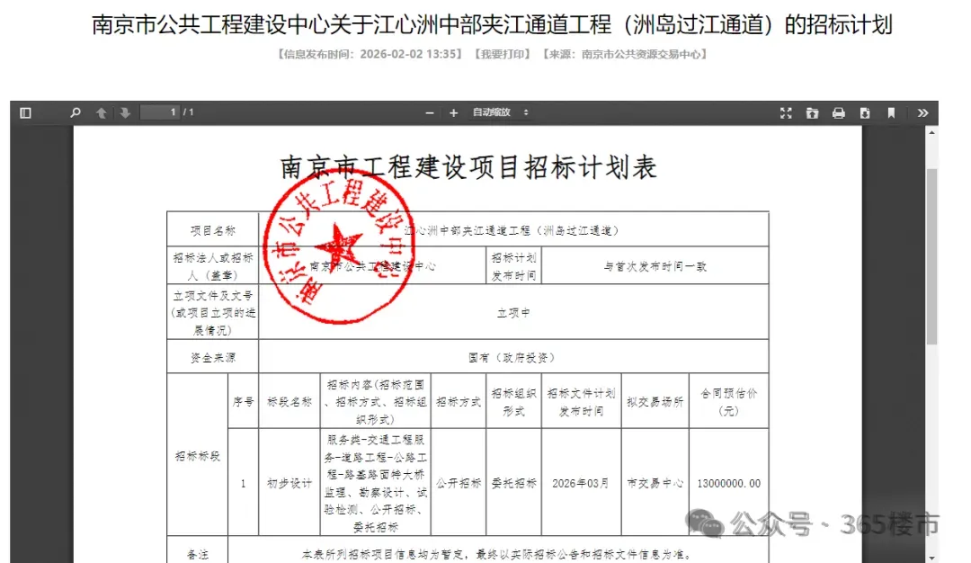 就在前不久,南京市公共工程建设中心关于江心洲中部夹江通道工程(洲岛过江通道)的招标计划发布。根据文件显示,项目标段名称为初步设计,招标文件计划发布时间为2026年3月,合同预估价为1300万。