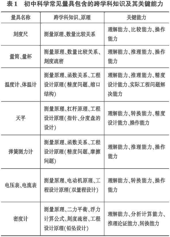 量具是一种在使用时具有固定形态、用以复现或提供定量的一个或多个已知量值的器具。发明绝对温标的物理学家开尔文曾言“实现测量并能用数量表述,才算真知”。这里的“真知”指的就是量具本身蕴含丰富的核心概念和跨学科概念以及关键能力。梳理初中科学常见量具包含的跨学科知识及其关键能力(见表1)。从制作量具项目需求入手,设计并在制作的过程中不断迭代,最终创造出能解决真实问题的量具,从而实现跨学科项目化学习所倡导的为了解决一个真实而复杂的问题,学生学习并创造性地整合不同学科的核心知识和能力,以形成整合性的项目成果和新理解。